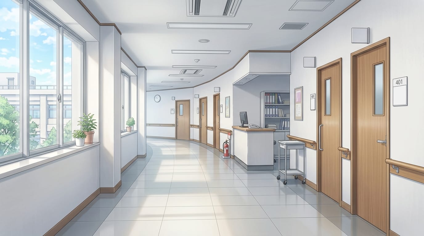 Free hospital background illustration assets available. Designed in a 16:9 horizontal format, making them ideal for PC-based projects. Suitable for use in manga, webtoons, and game backgrounds, with commercial use and tracing permitted.