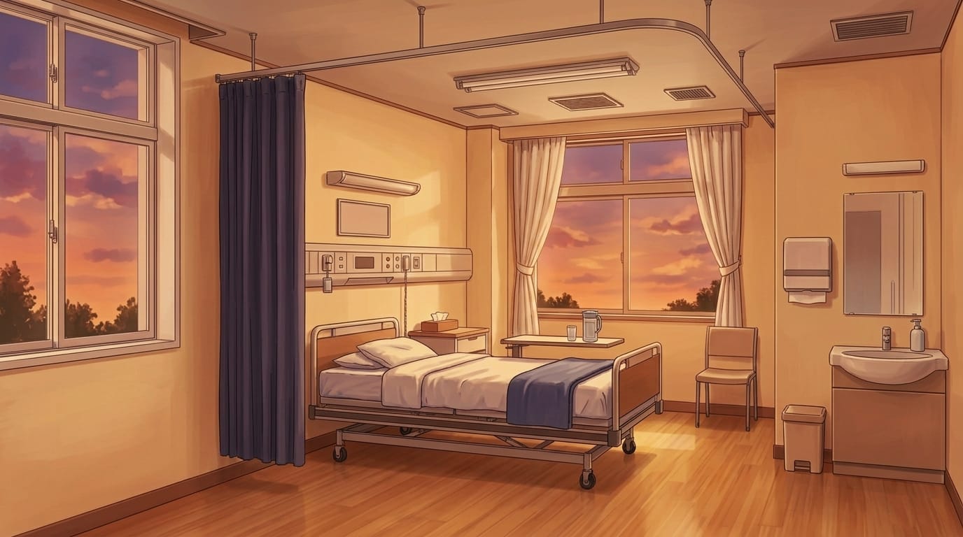 Private hospital room at sunset with patient bed | Background illustration asset