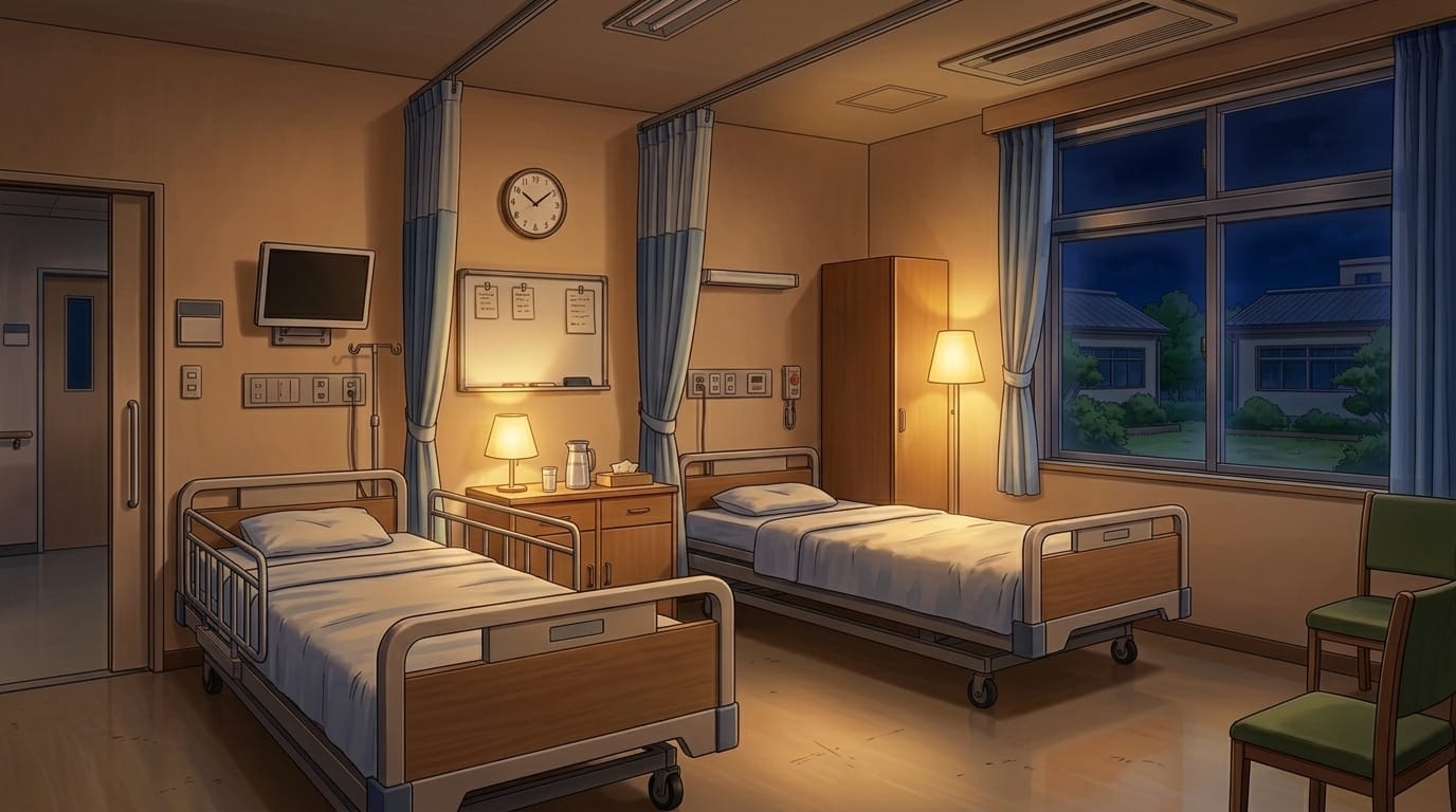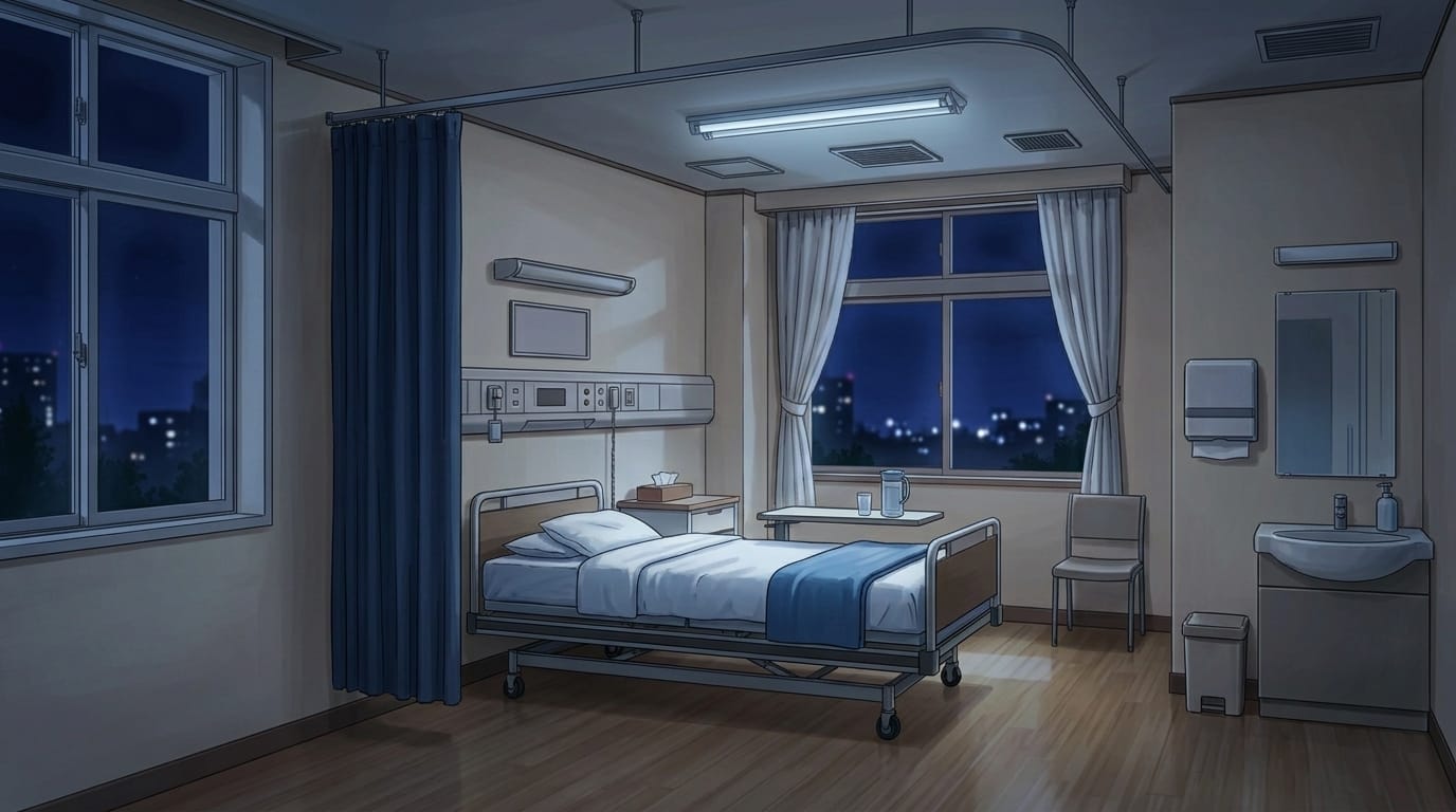 A quiet nighttime hospital room with soft lighting.
