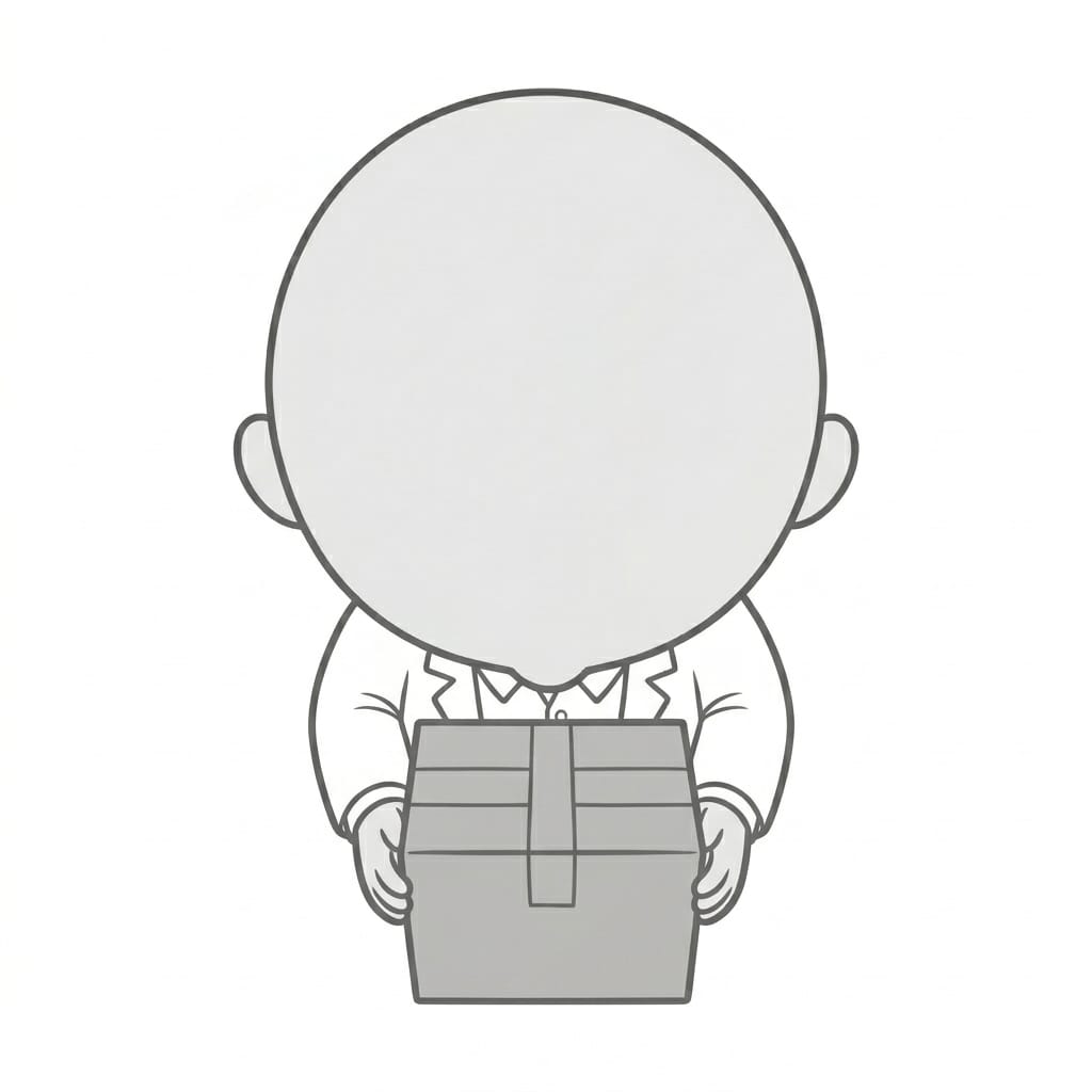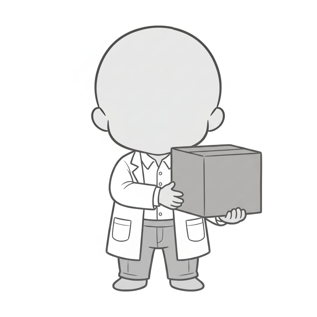 Front-facing pose of a child in a lab coat carrying a cardboard box | Chibi work pose asset