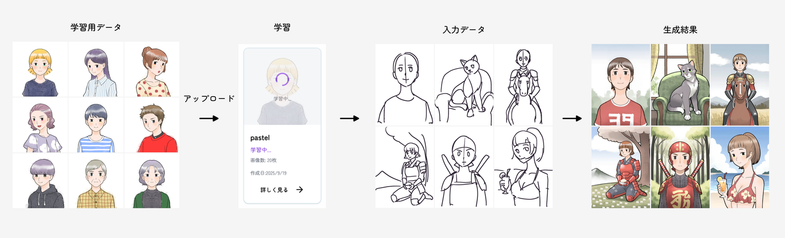 With this feature, you can train AI on your own characters or art styles and retain custom models for use in line art generation, coloring, image transformation, and more.