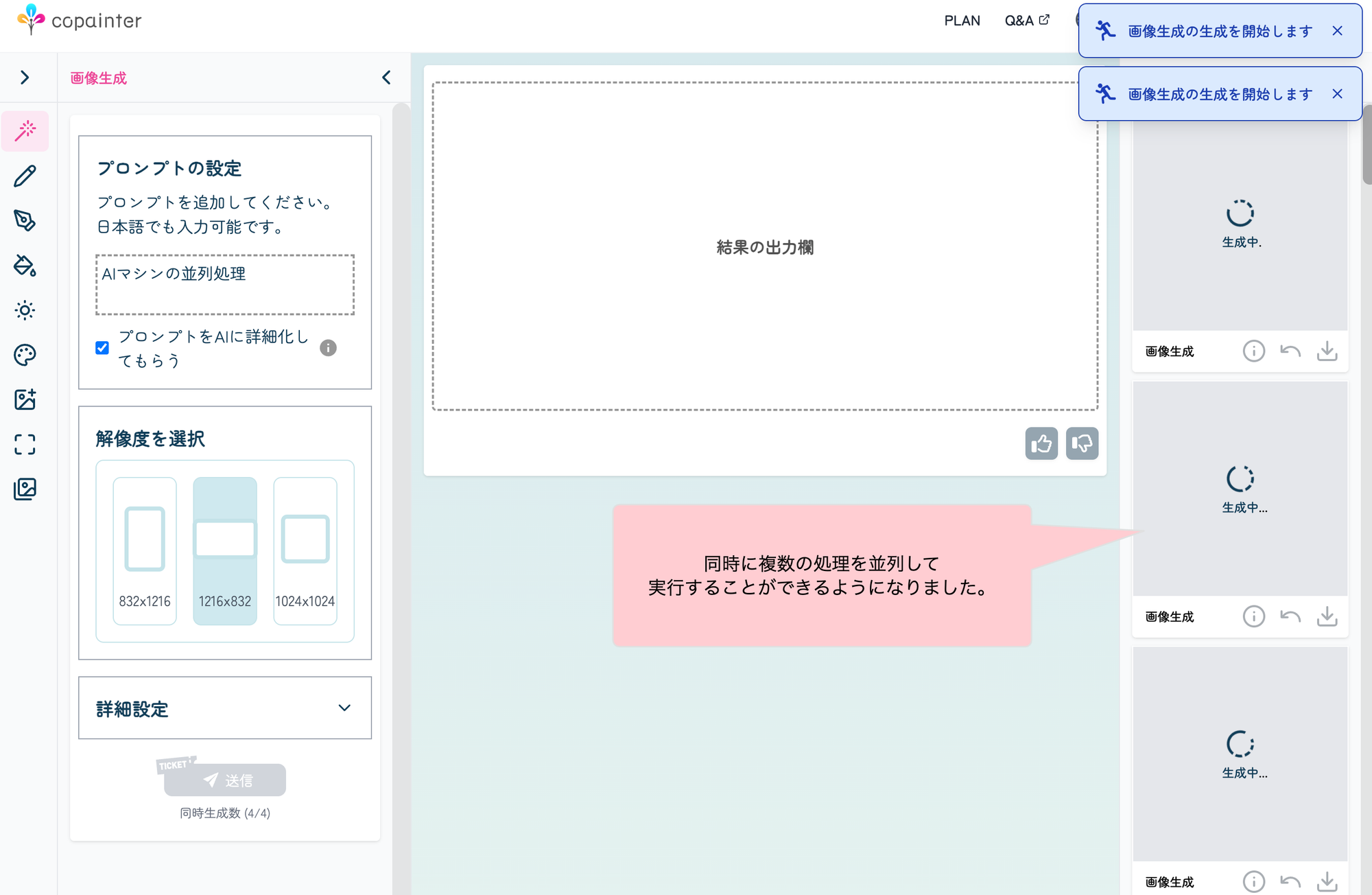 これまでは1つの処理が完了するまで同じ画面で待機をしないといけませんでしたが、今回のアップデートによってAIによる処理を実行中の待ち時間の間に他のAI を実行することが可能となりました。