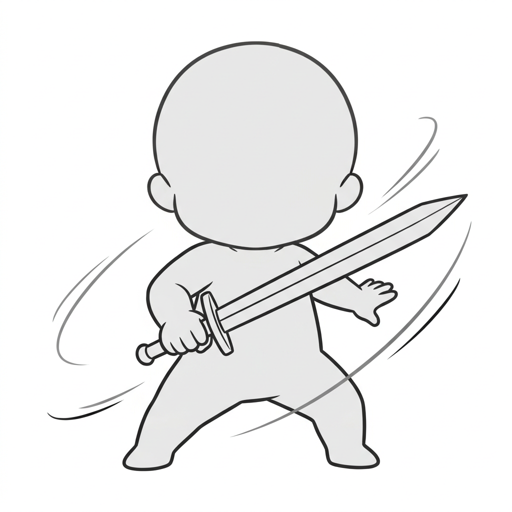 剣を振り抜くデフォルメ剣士|ちびキャラソードアクション素材