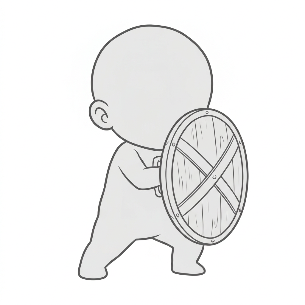 盾で身を守るデフォルメガード姿勢|ちびキャラ防御バトル素材