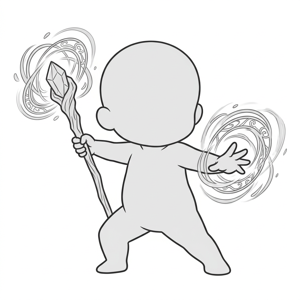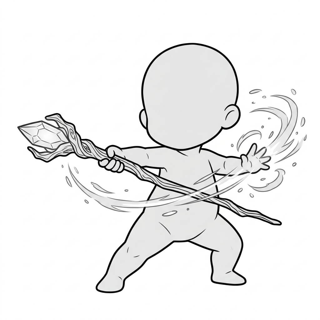 杖を突き出して魔法を放つデフォルメポーズ|ちびキャラ魔法アクション素材
