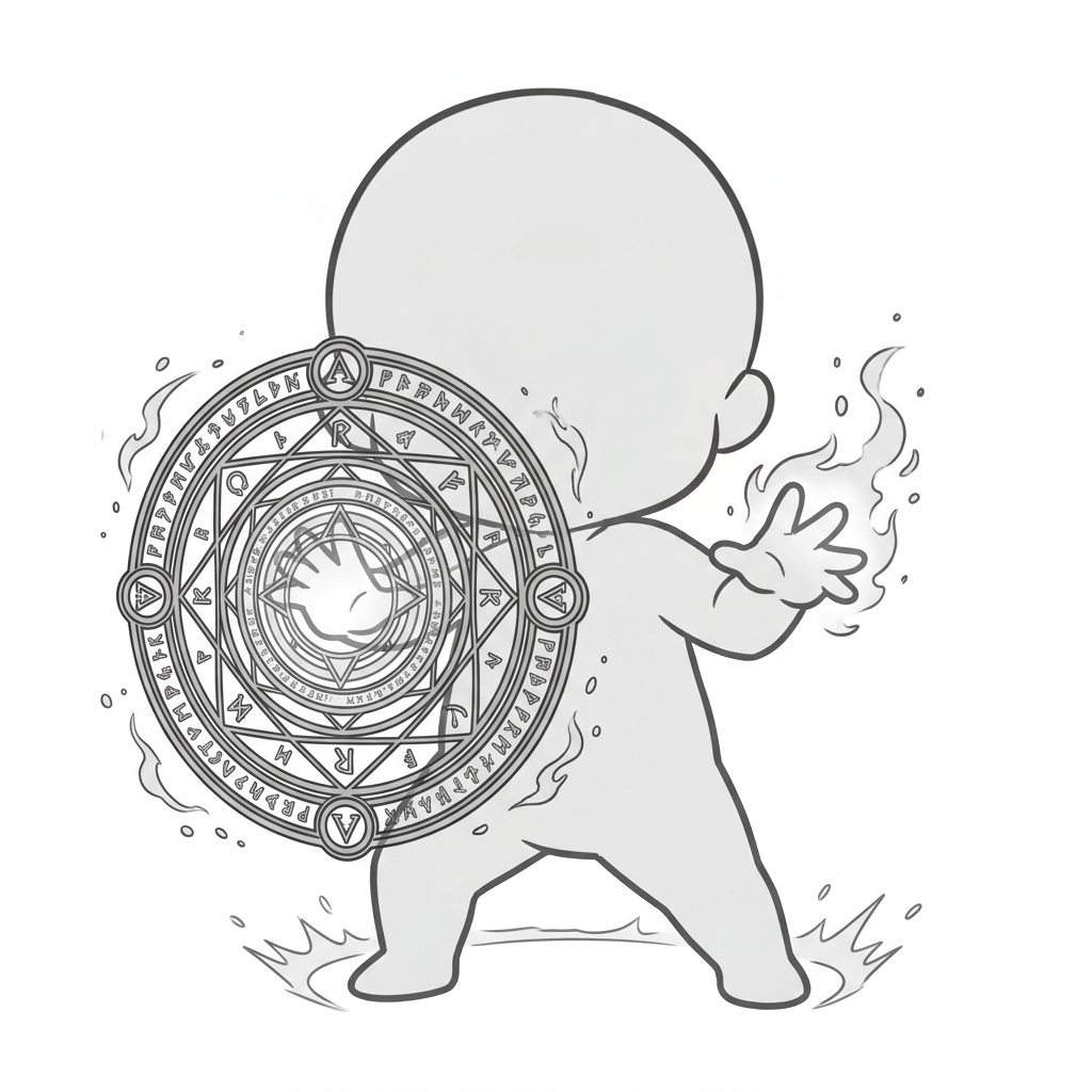 魔法陣シールドを展開するデフォルメ防御姿勢|ちびキャラバリア素材