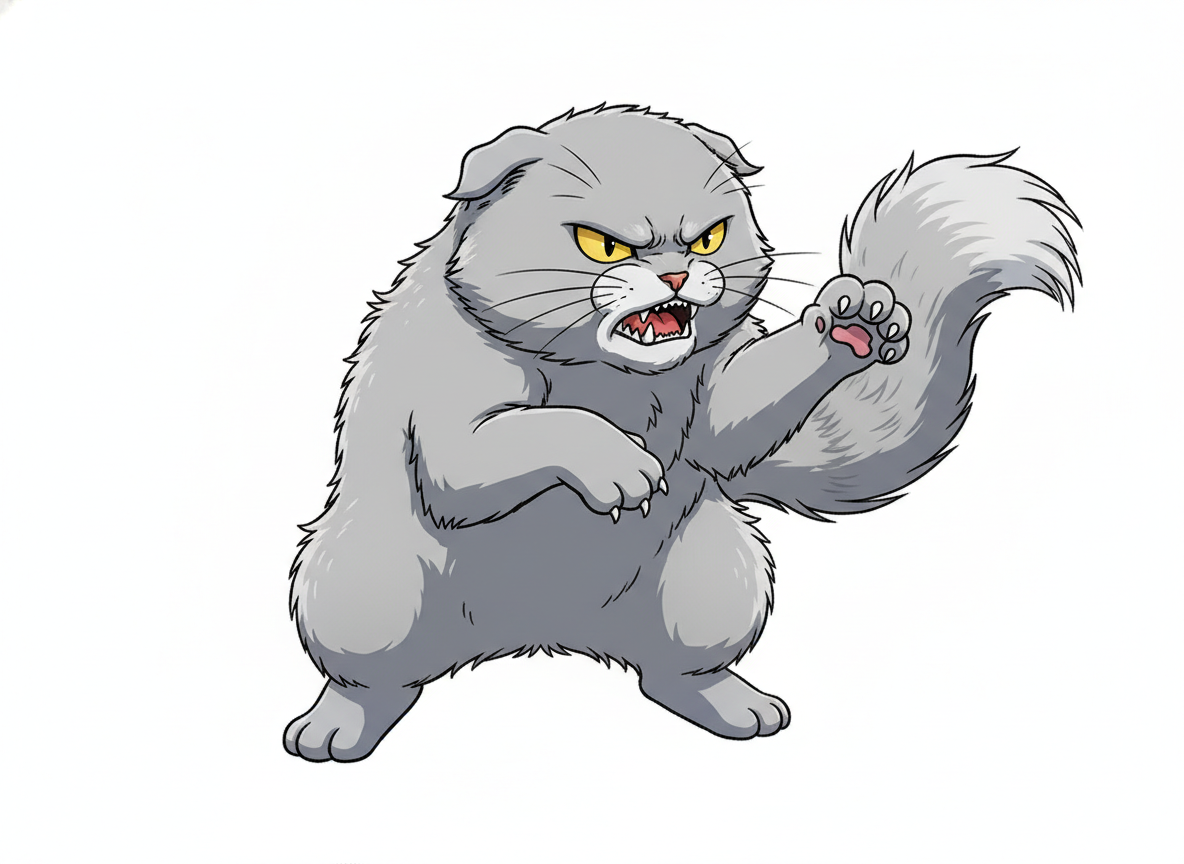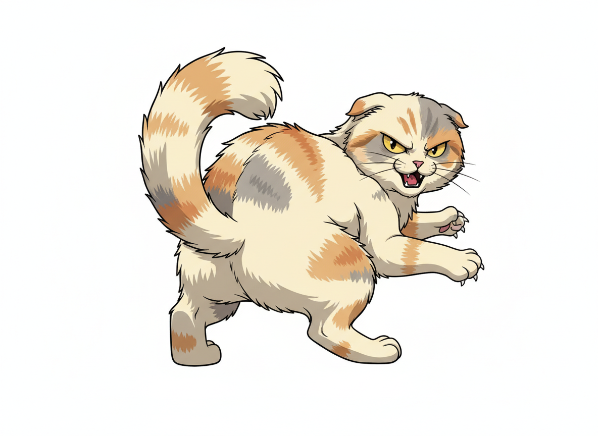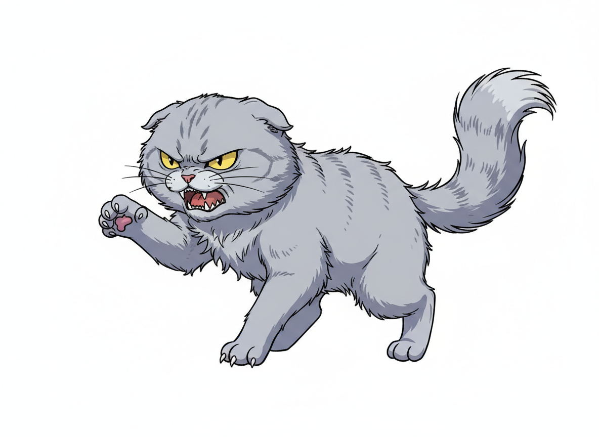 怒りを表す猫の姿。迫力のある表情と動きの描写に役立ちます。