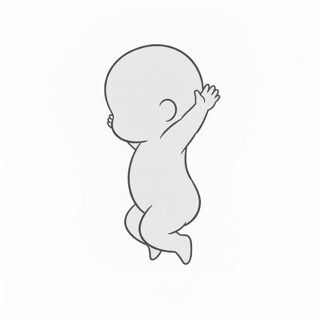 両手を大きく上げて勢いよく飛び上がる子供の後ろ姿をシンプルな線画で描いたポーズ素材です。