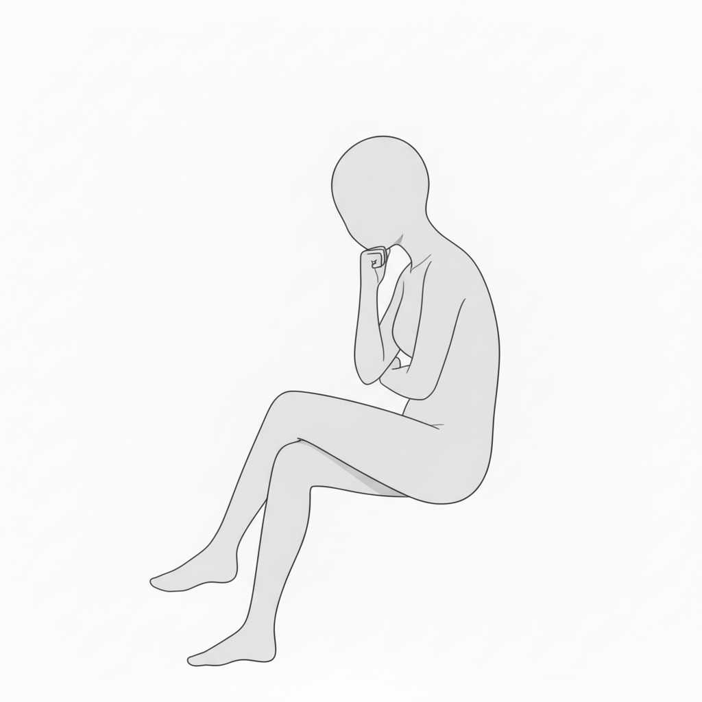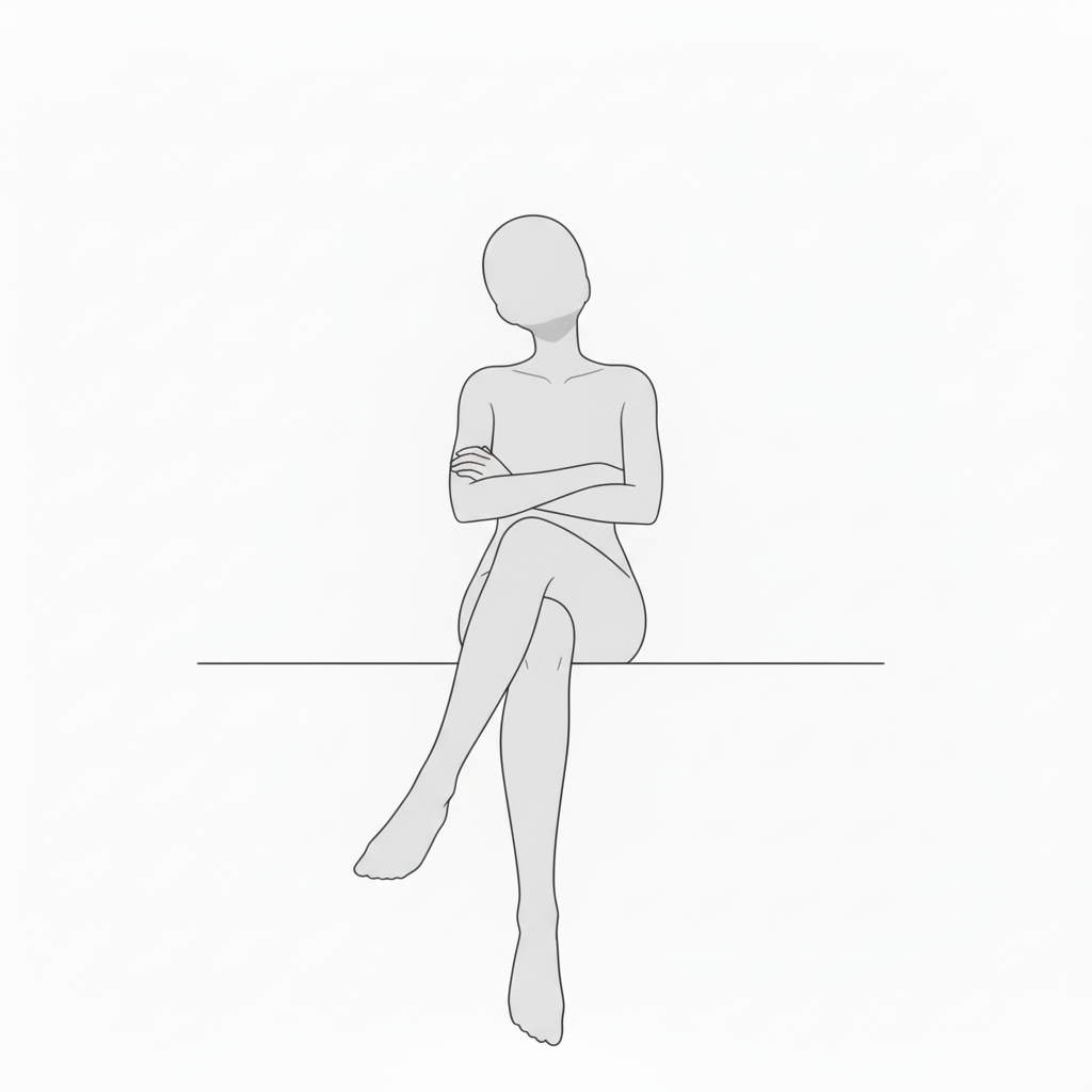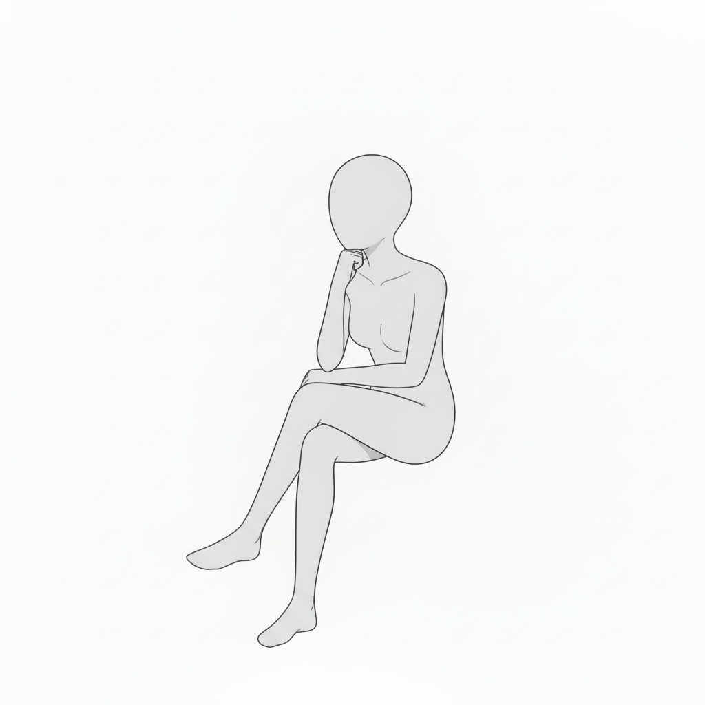 軽く体を丸めて考え込むポーズ。感情表現やストーリー性のある構図に向いています。