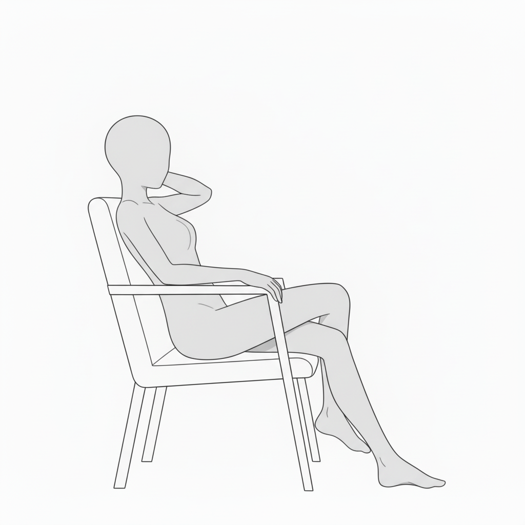 深く椅子に座り、体を少し傾けた構図。余裕や安心感を表現する場面に最適です。