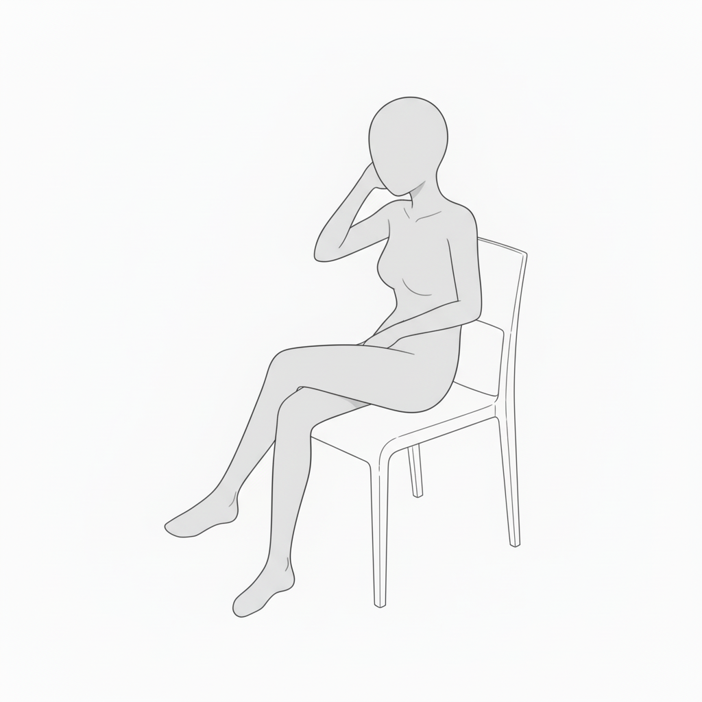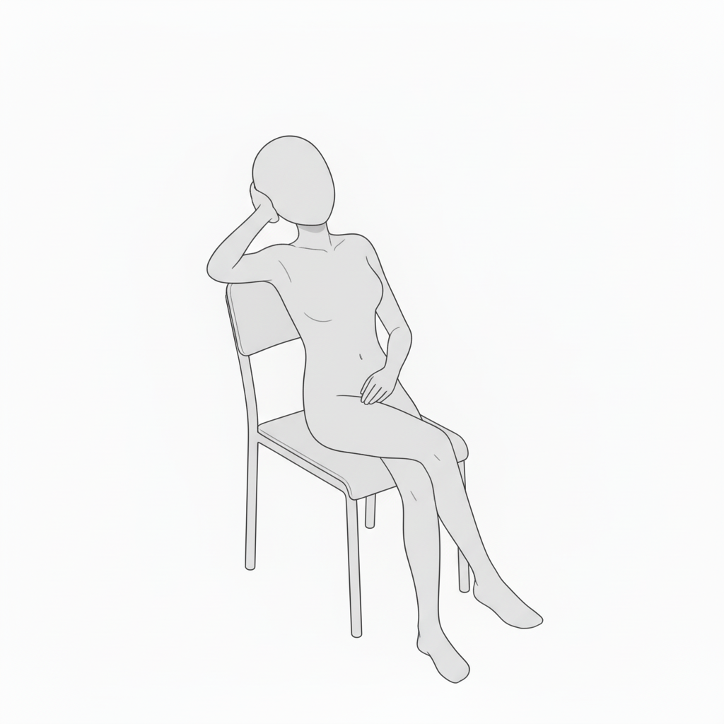 椅子にもたれながら片手を首に添える姿勢。落ち着いた雰囲気の作画資料におすすめです。