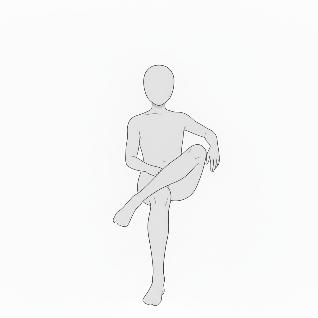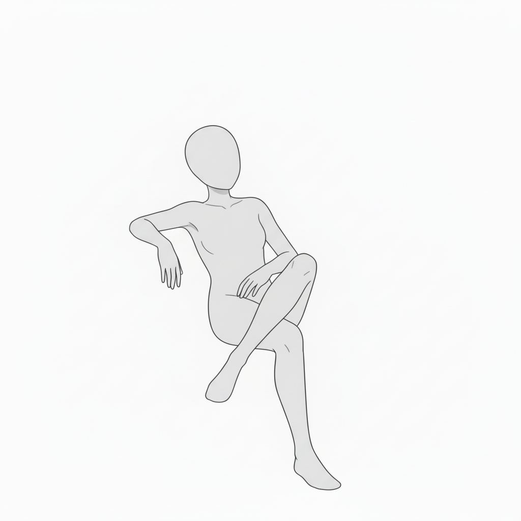 肘を膝に乗せたラフな姿勢。日常的な自然さを描きたいときに役立ちます。
