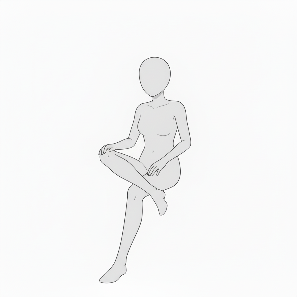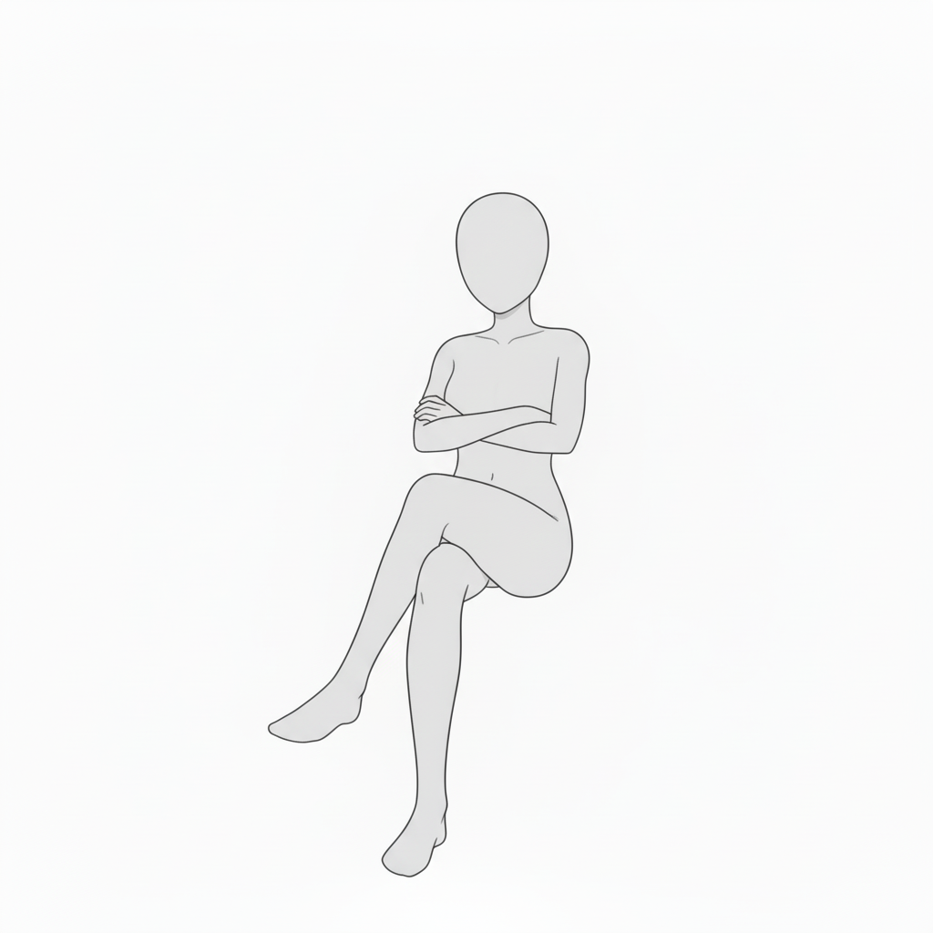 足を組んでまっすぐ座る基本構図。上品で穏やかな印象を与えるシーンに最適です。