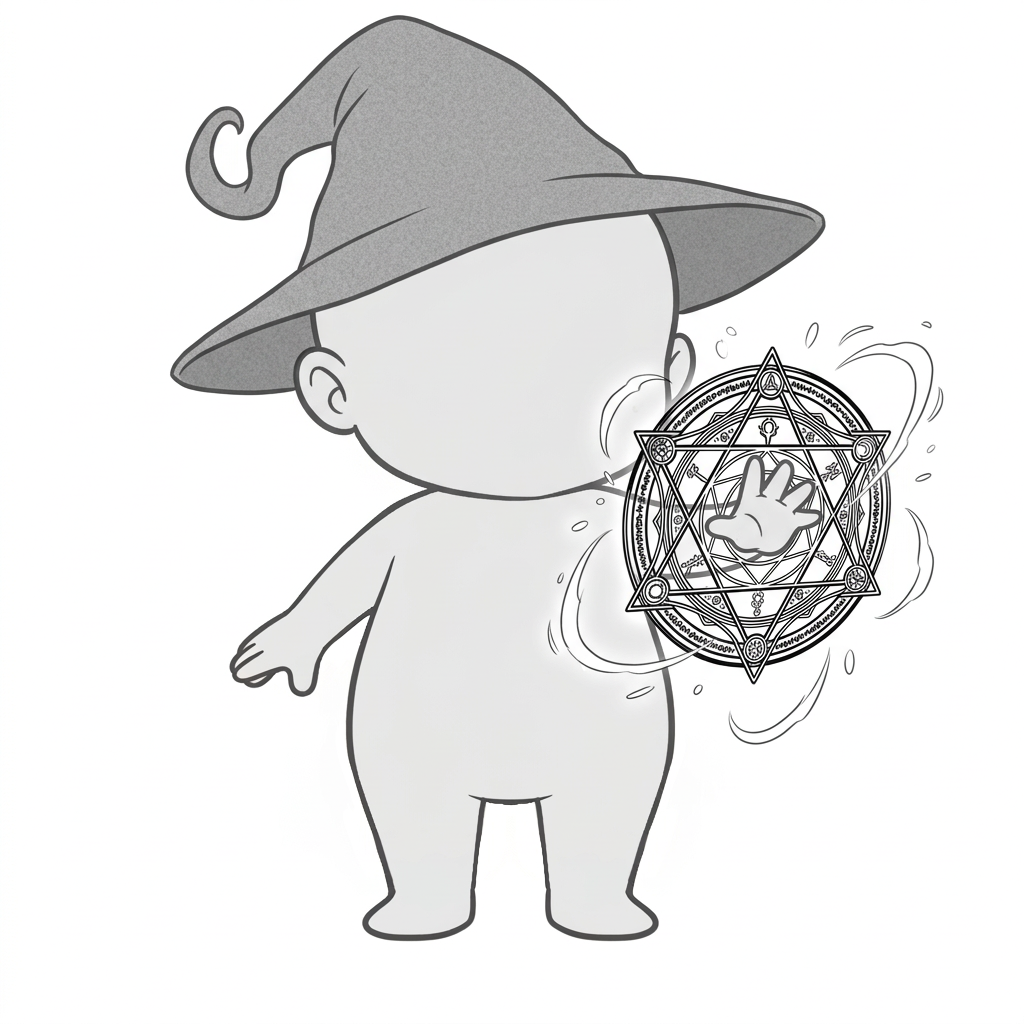 手の前に大きな魔法陣を出現させて防御するデフォルメ魔法使いのポーズ素材です。
