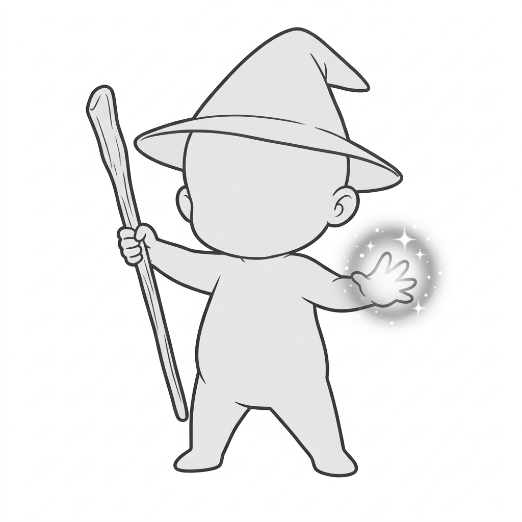 杖の先から光る魔法を生み出すデフォルメ魔法使いの立ちポーズ素材です。