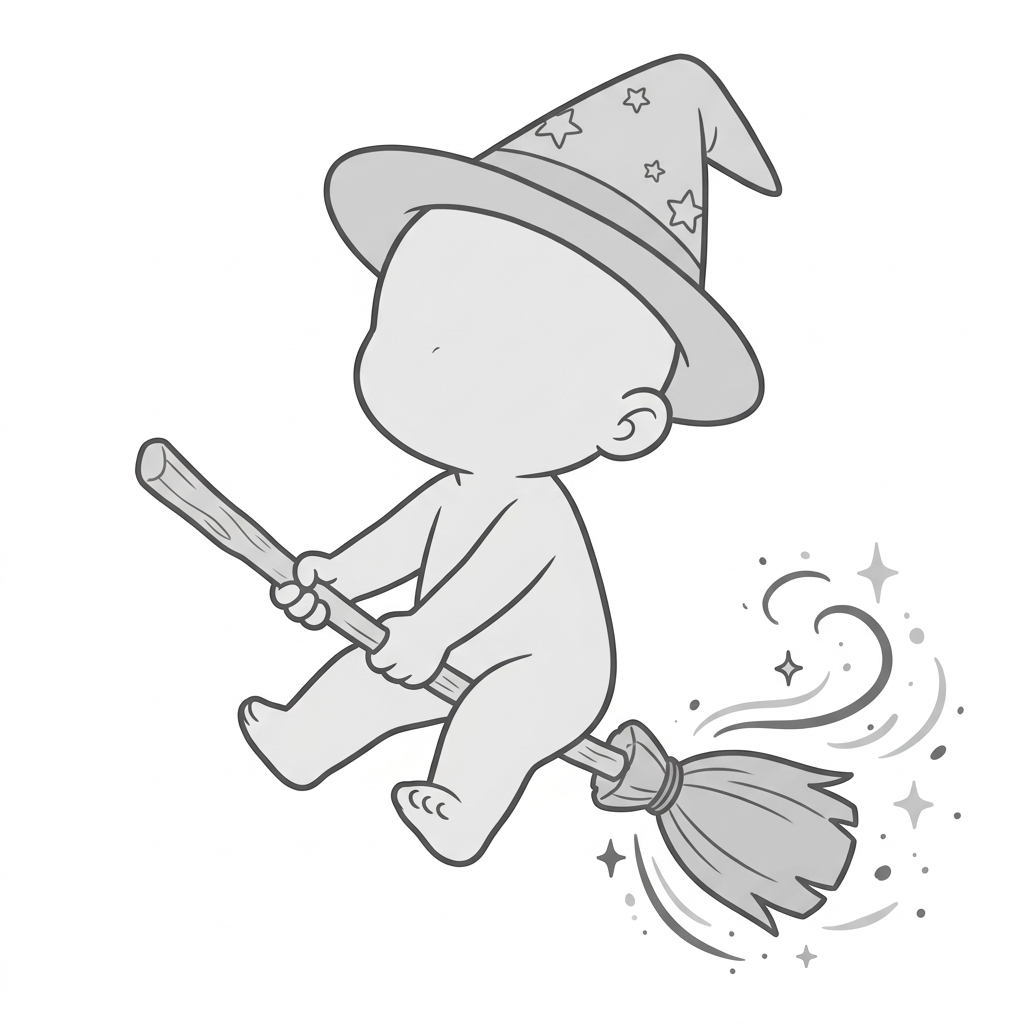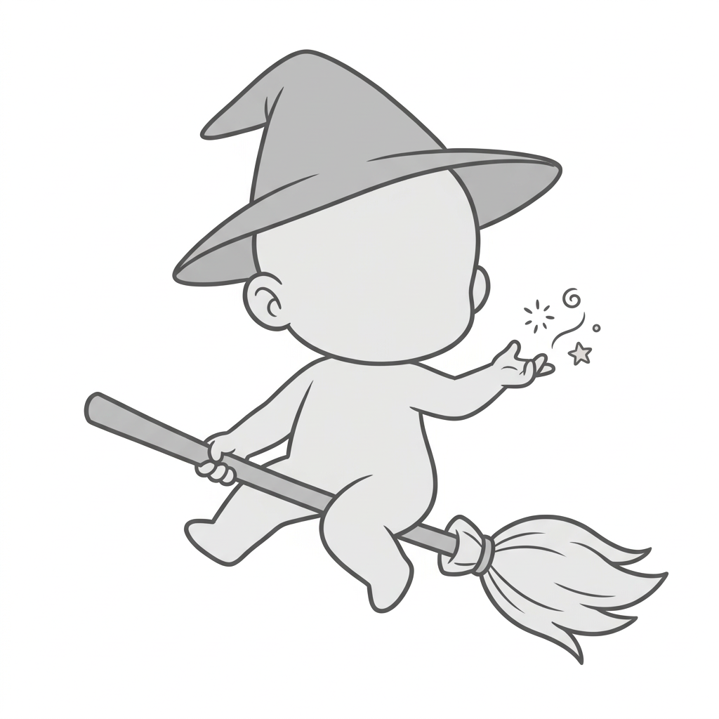 ほうきに乗って飛ぶデフォルメ魔法使い|ファンタジー飛行ポーズ素材