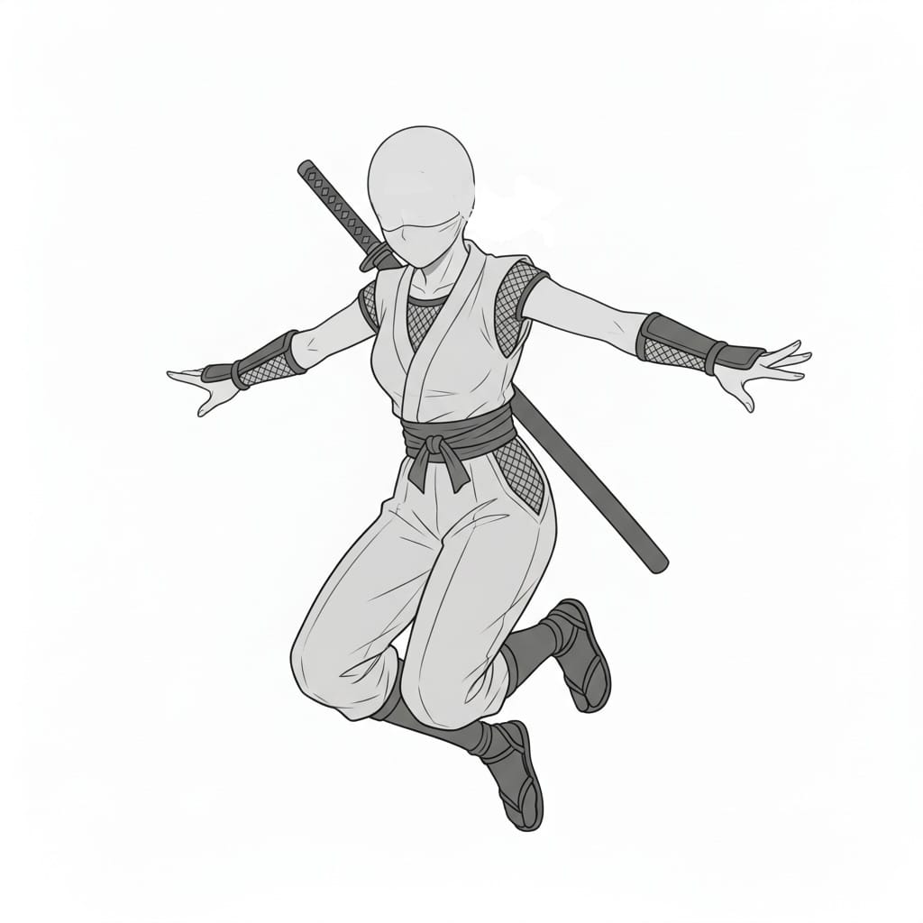 空中で跳ぶ女忍者のジャンプポーズ|アクション作画用ポーズ素材