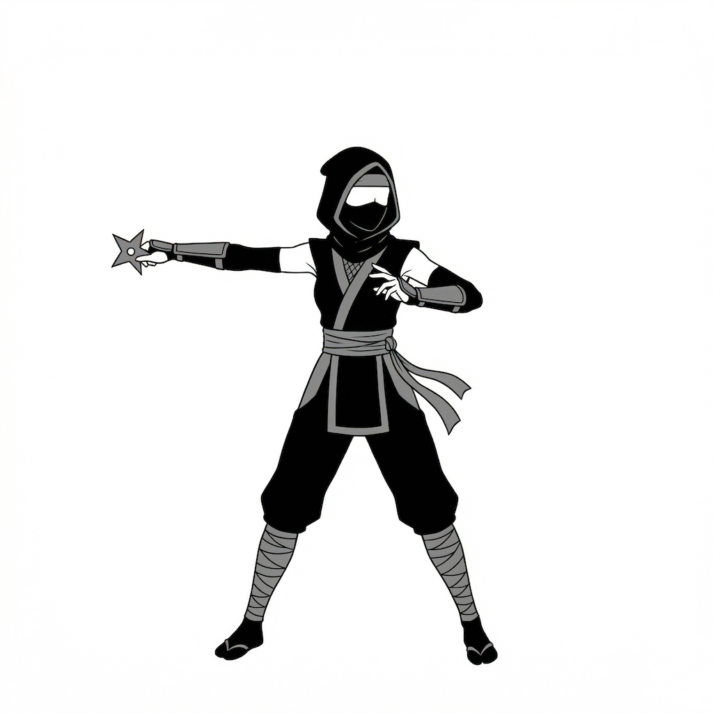腕を大きく伸ばして手裏剣を放つ瞬間を表現した、攻撃動作の演出に最適なポーズ素材です。