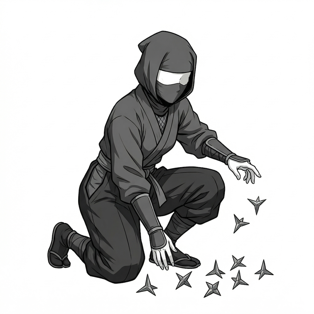 しゃがんで撒菱を準備する女忍者ポーズ|忍者アイテム演出素材