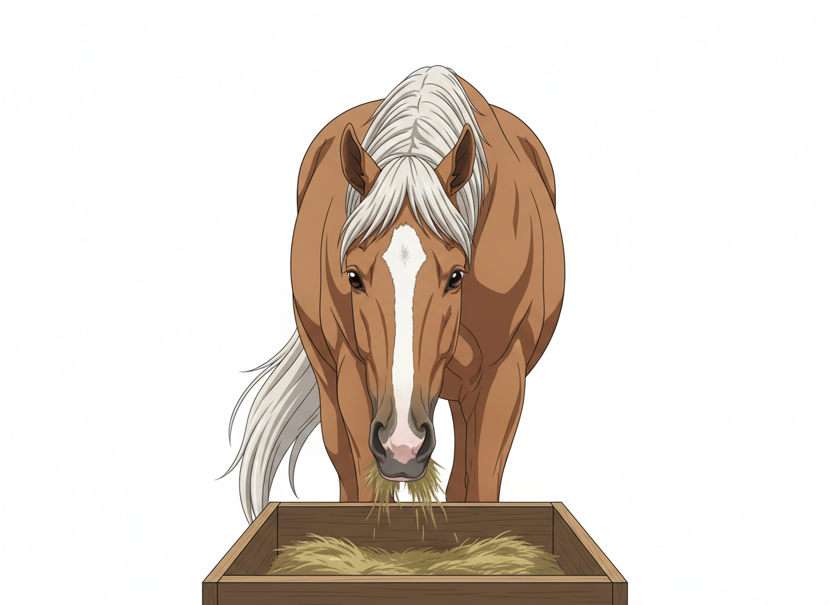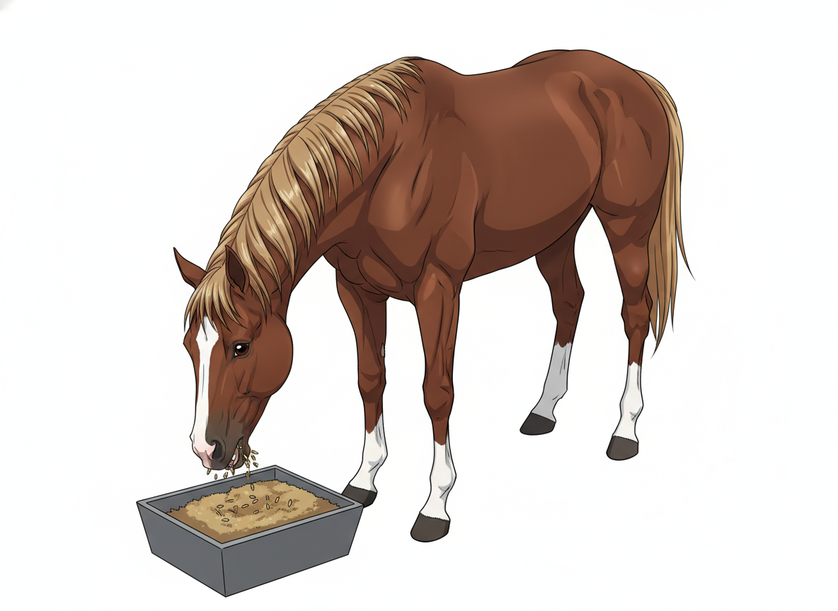馬が飼葉桶から餌を食べる瞬間を描いたポーズ。リアルな動きの資料に最適です。