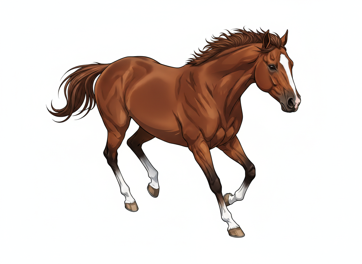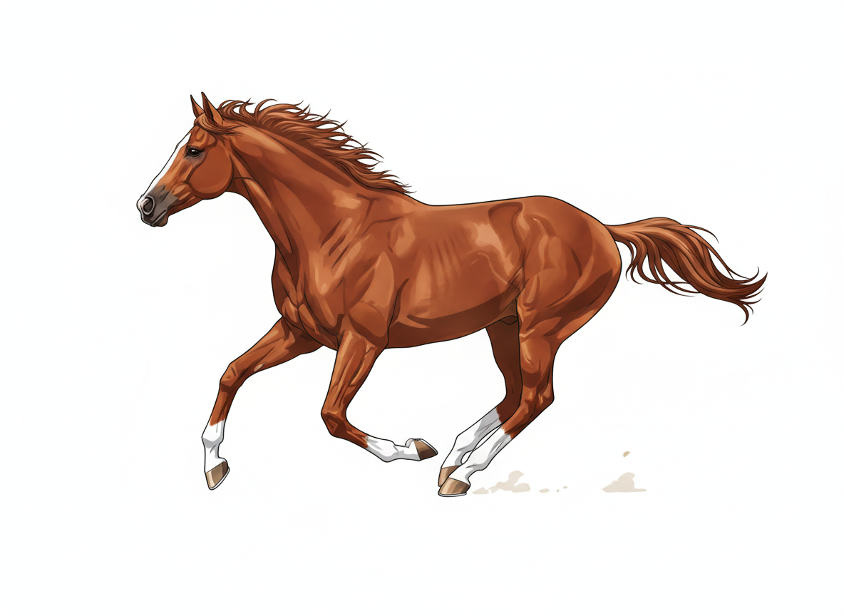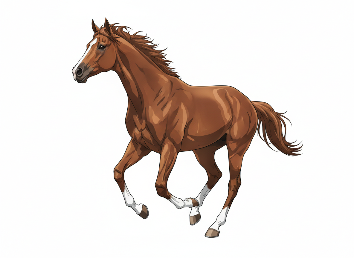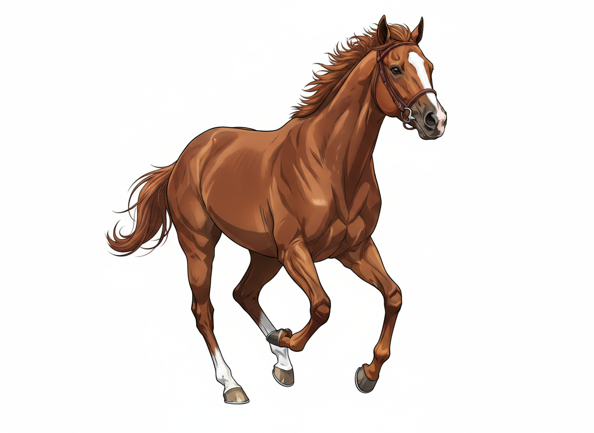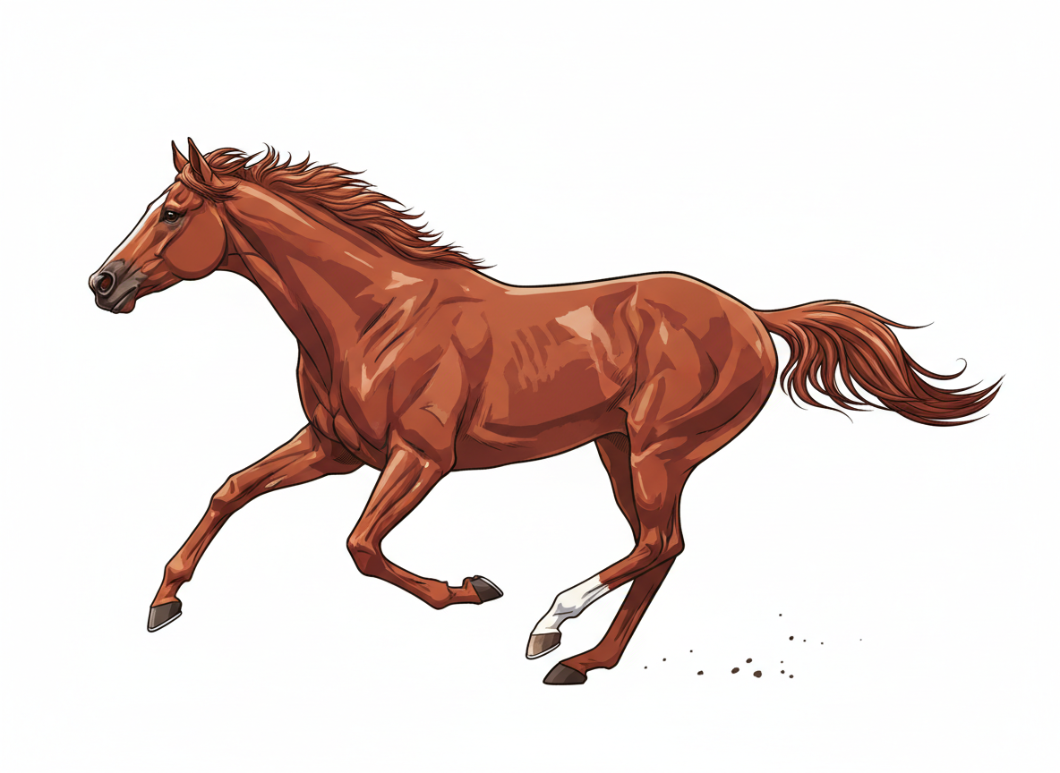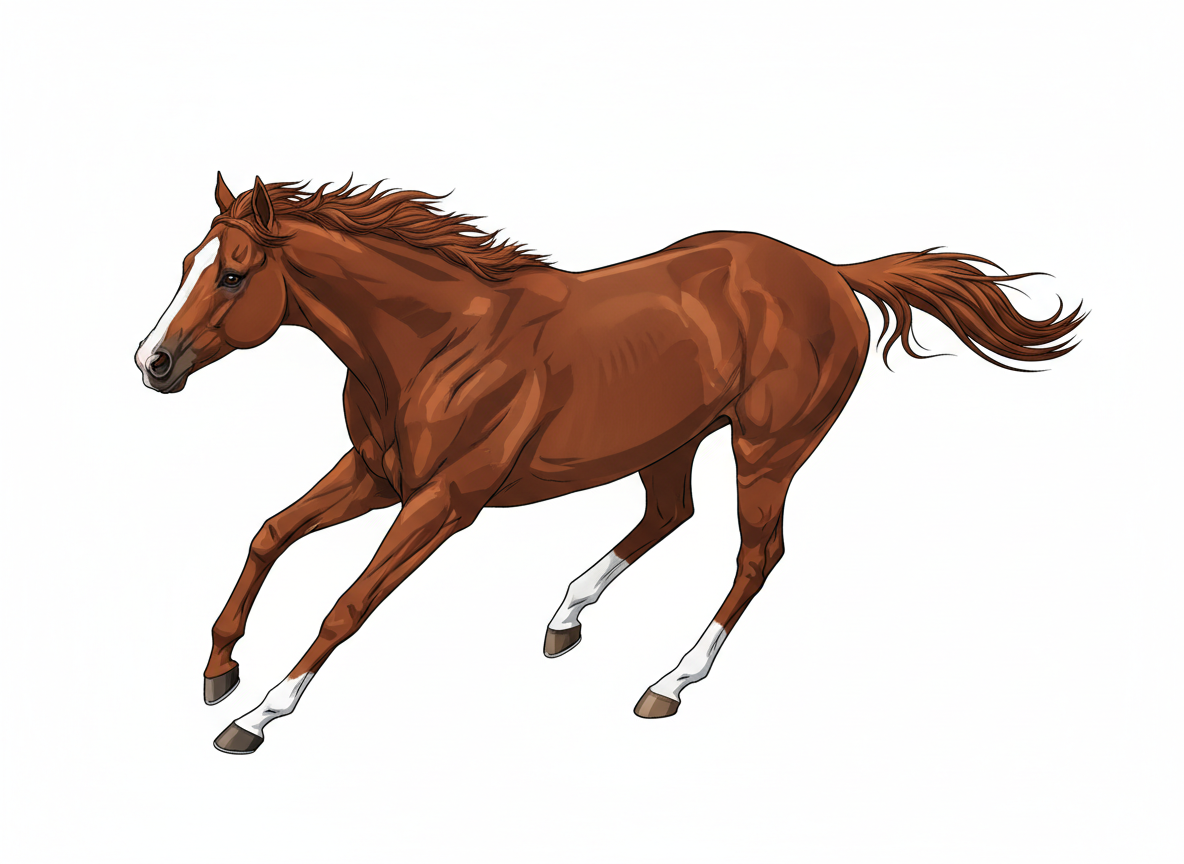 躍動感のある左向き疾走ポーズ。アクション構図や競馬シーンにも使えます。