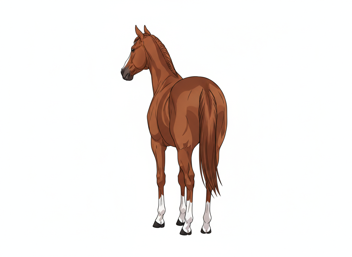 後方から見た馬の立ち姿。体のラインを理解するための構図資料に最適です。