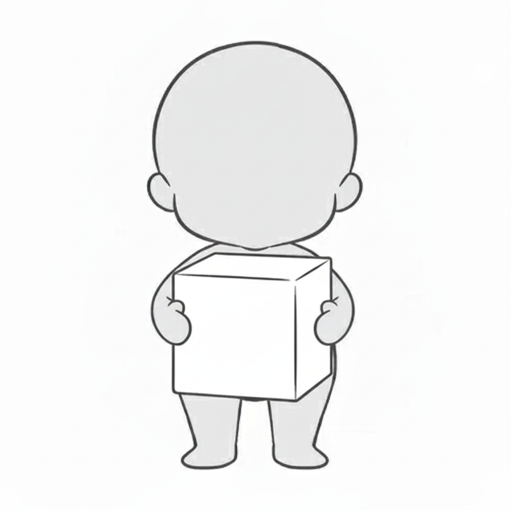両手で段ボール箱をしっかり抱える正面向きの運搬ポーズ素材です。