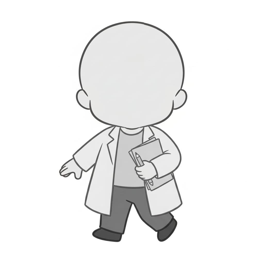 書類を抱えて歩く白衣の子どもを表現した、医療や研究シーン向けのかわいい全身ポーズ素材です。