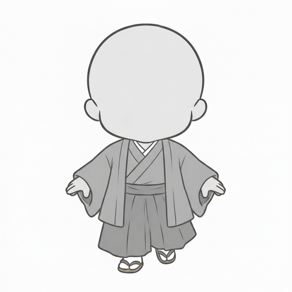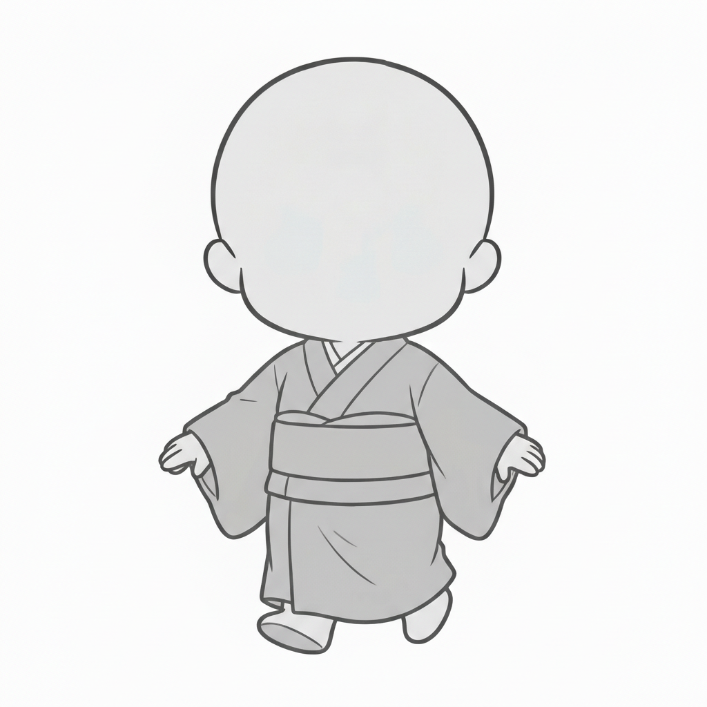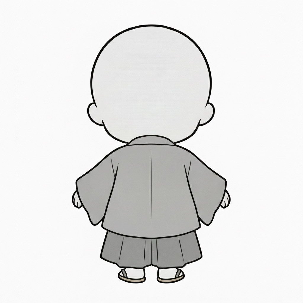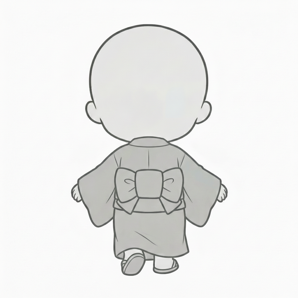 小さな体格と和服のシルエットが分かりやすく、振り返り前の演出に適しています。