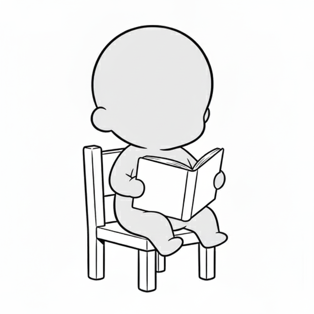 椅子に座るチビキャラ幼児の読書ポーズ|斜め横向き