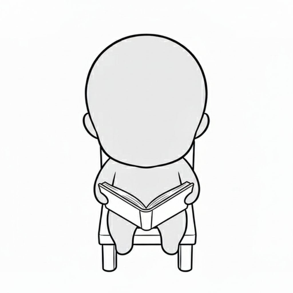 正面向きチビキャラ幼児の読書ポーズ|椅子に座る全身構図