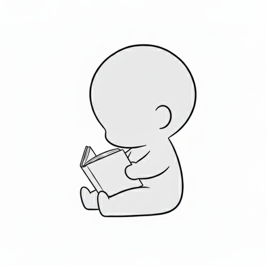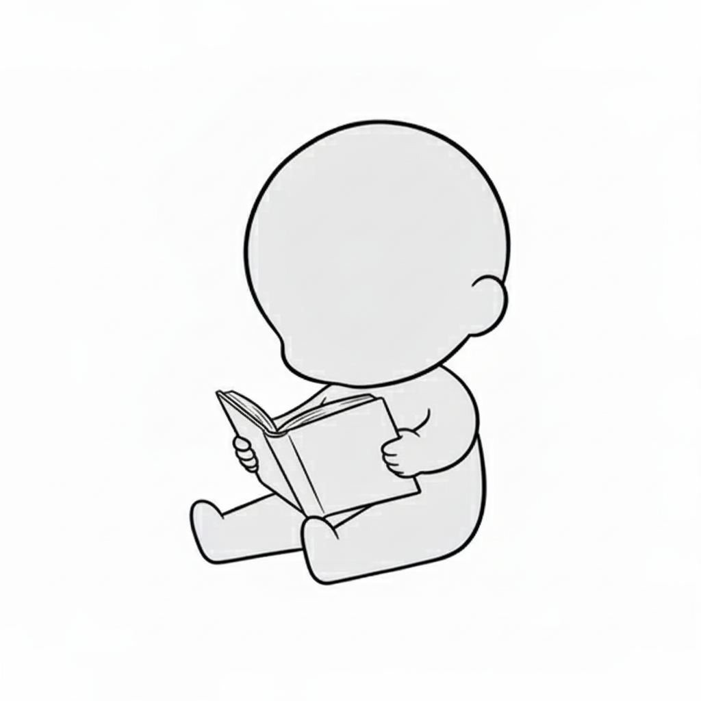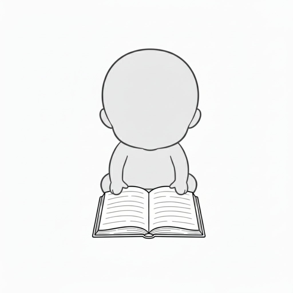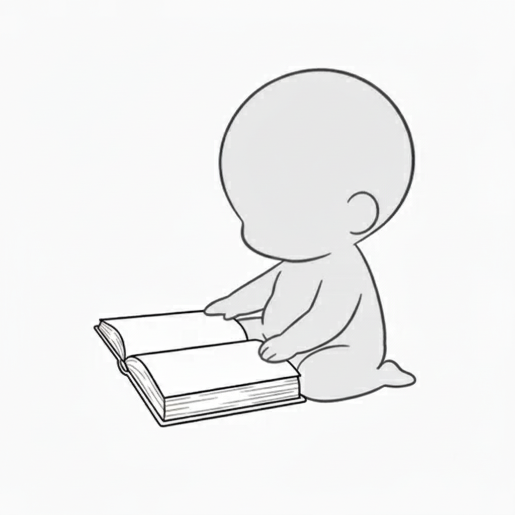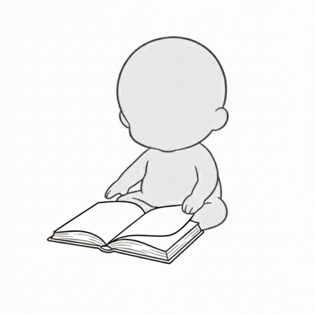 開いた本を床に置き前のめり気味にのぞき込む赤ちゃんを描いたポーズで、好奇心いっぱいの読書シーンを表現したいときに役立ちます。