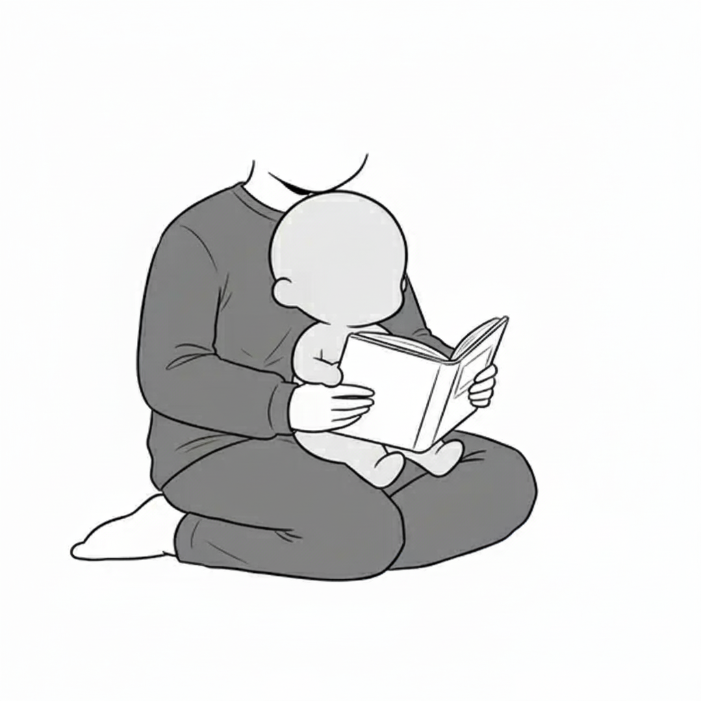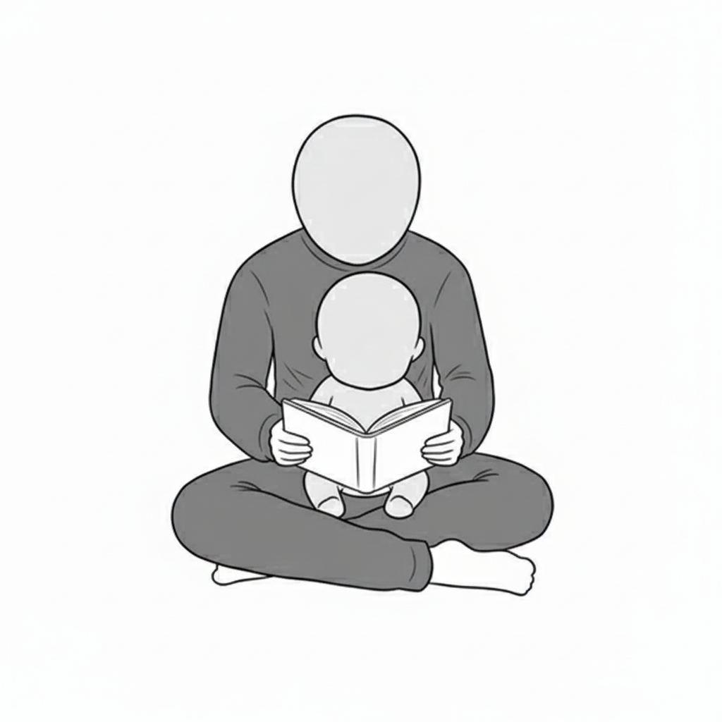 膝の上で絵本を読む赤ちゃんと大人|読み聞かせポーズ側面図