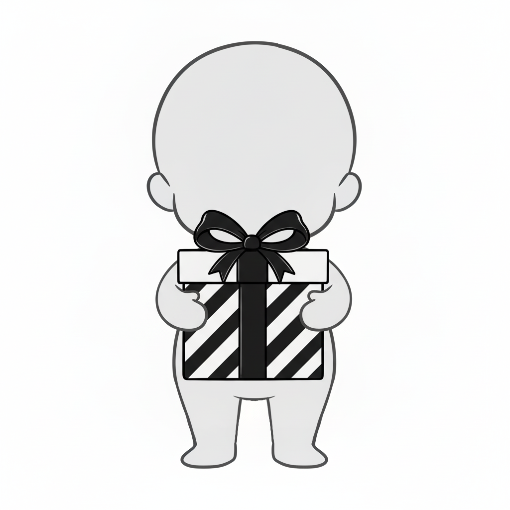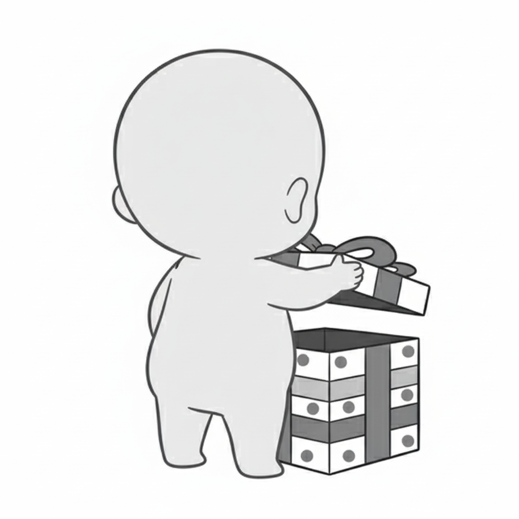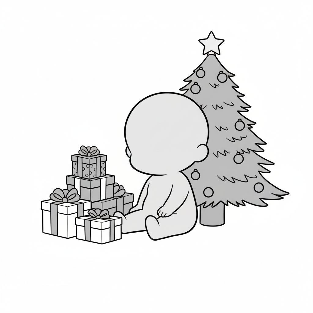 頭が大きく見える構図で、子どもの無邪気さと贈り物の存在感を強調しています。