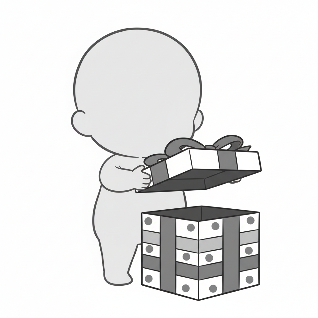 プレゼントの箱を開ける瞬間の高揚感を表現した、感情豊かなポーズ素材です。