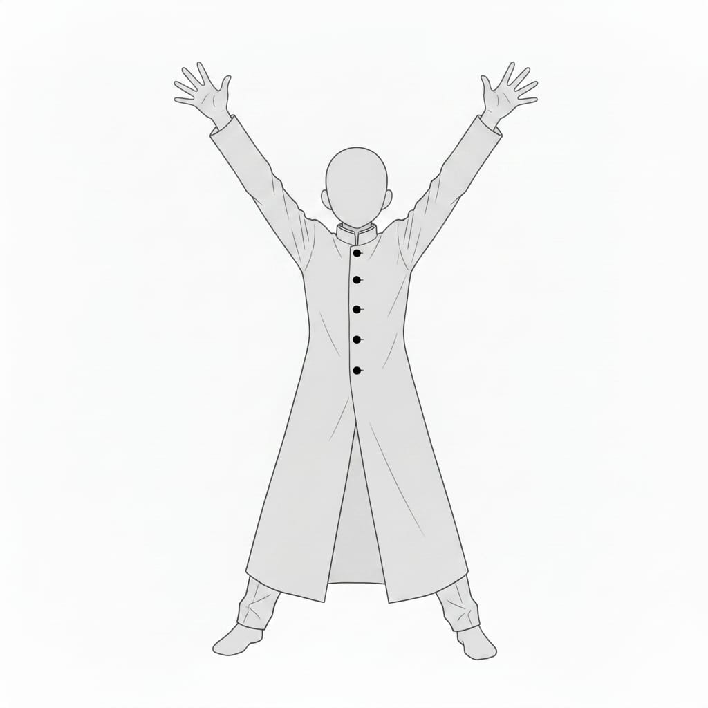 両手を大きく広げて応援する学生服の人物|応援団ポーズ線画素材