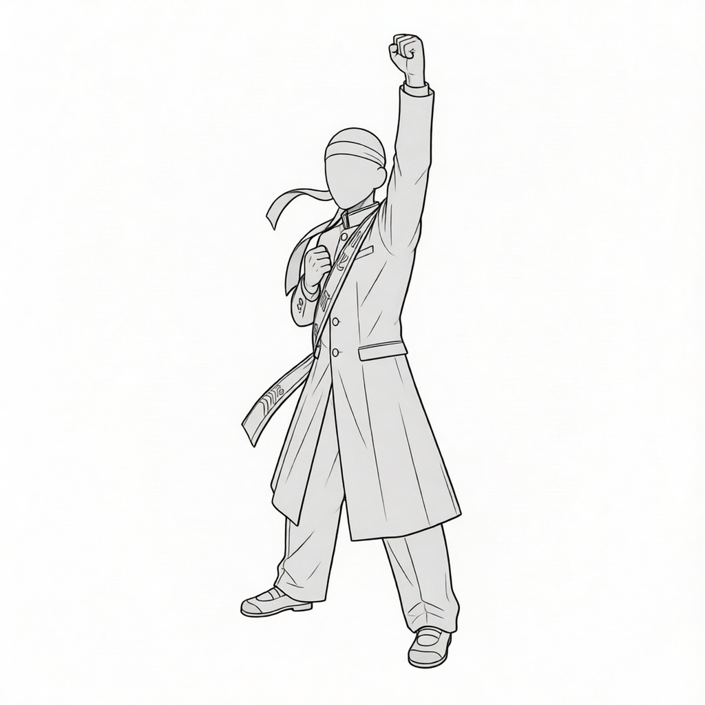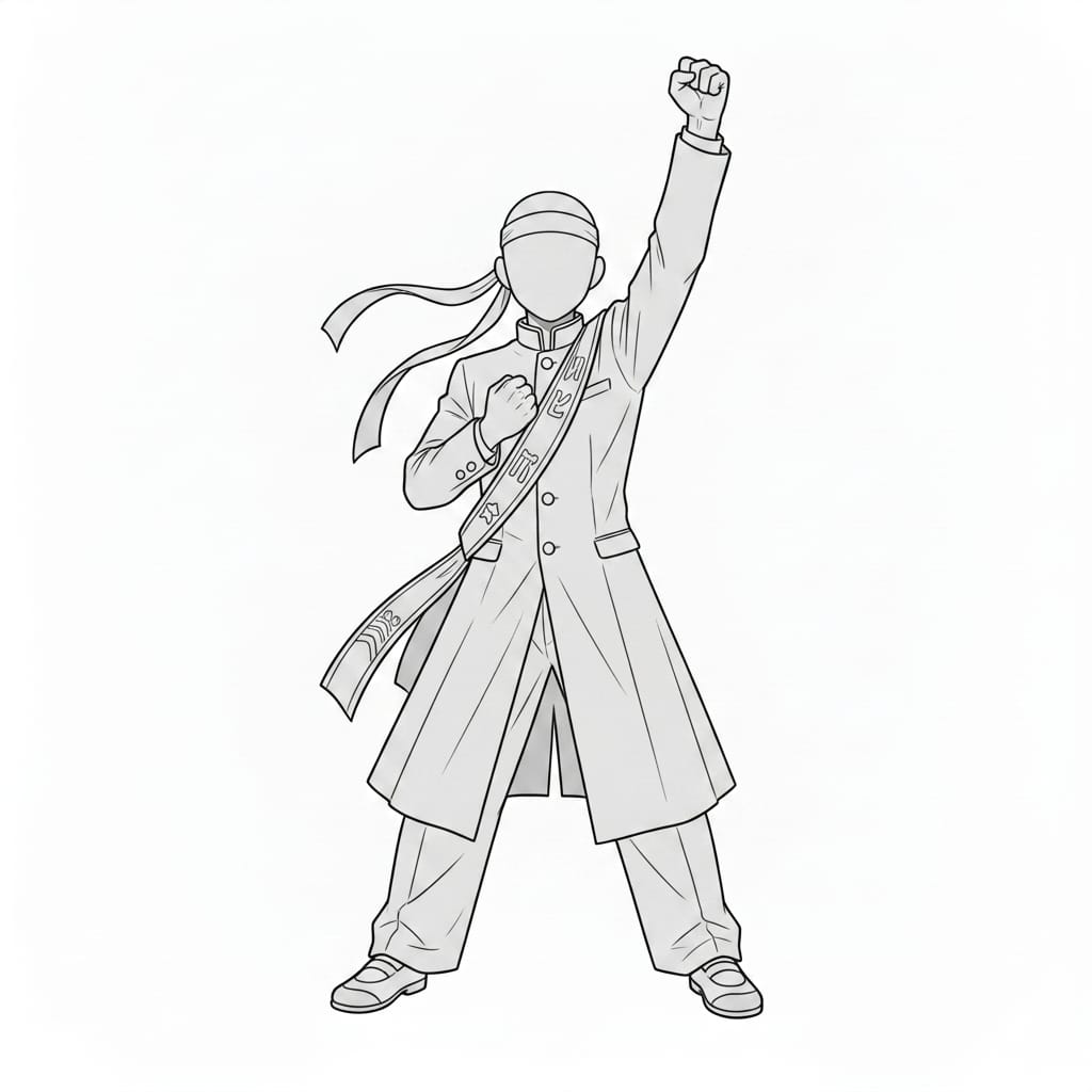 拳を突き上げる応援団の人物|学ラン姿のポーズ線画素材