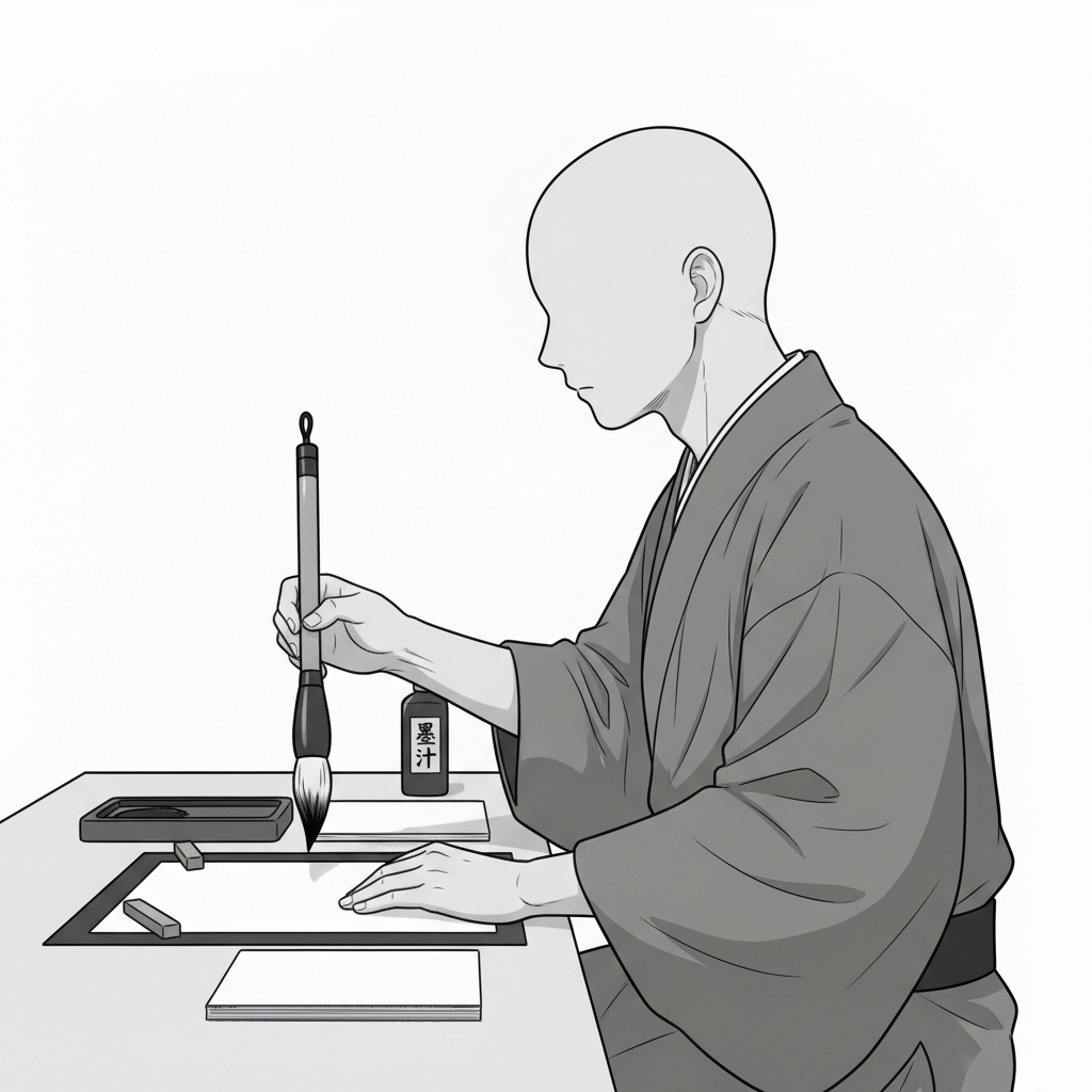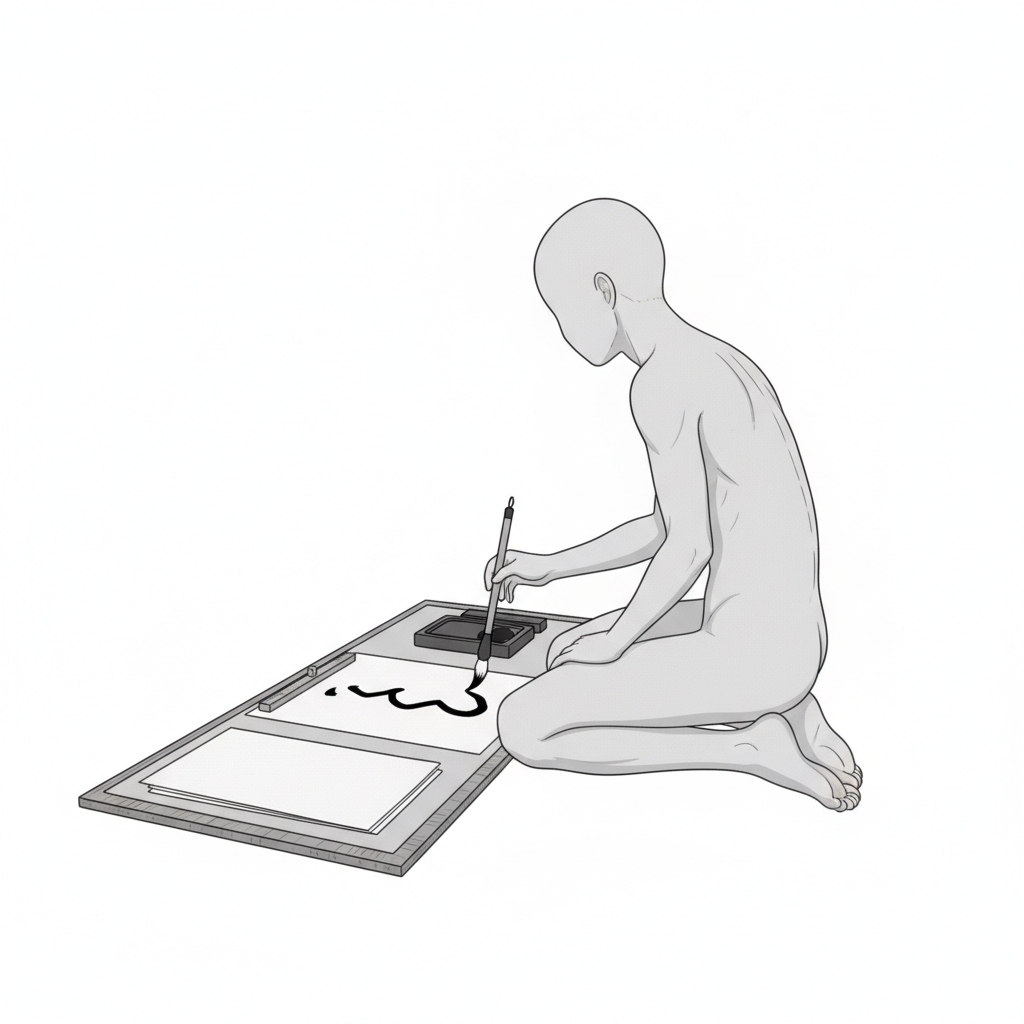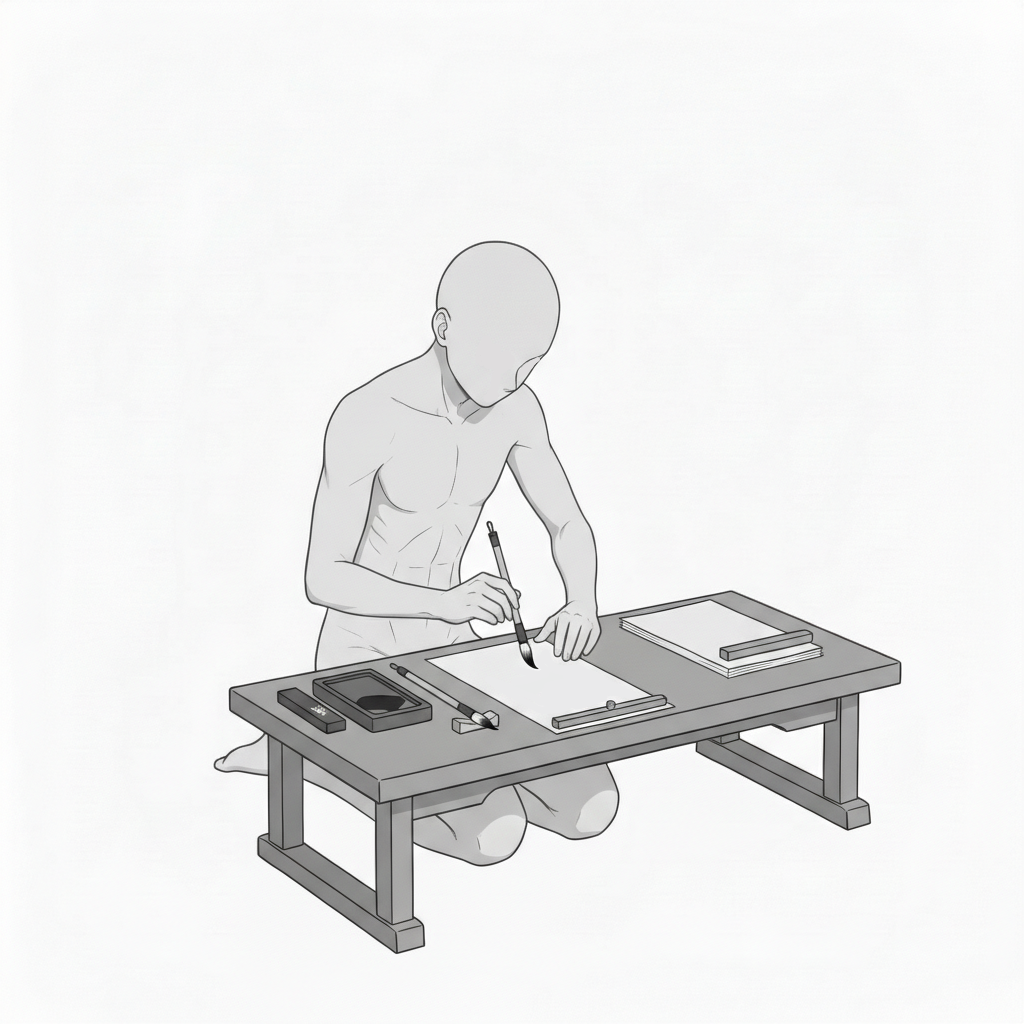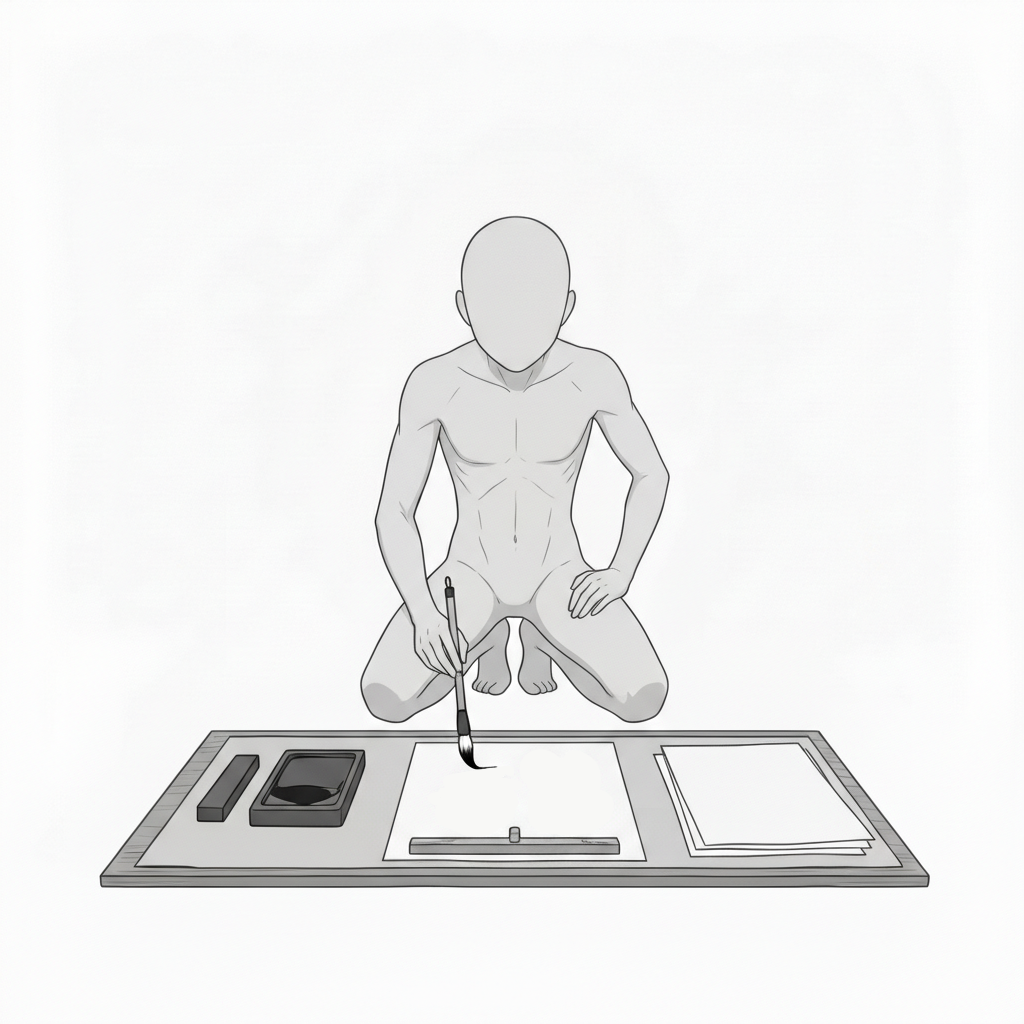 正座で半紙に向き合い、書道の基本となる安定した筆運びを表現したポーズです。