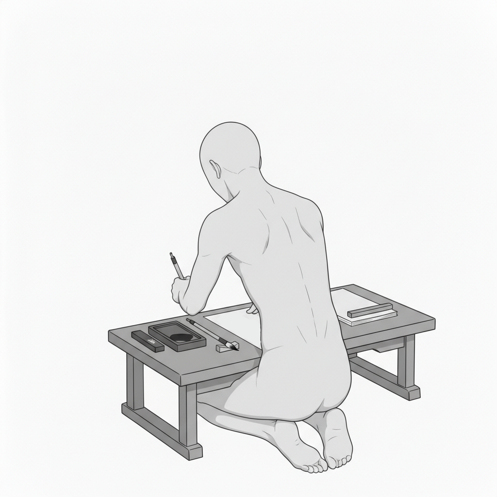 後方視点から、背筋と肩の動きが分かる書道練習向けのポーズです。