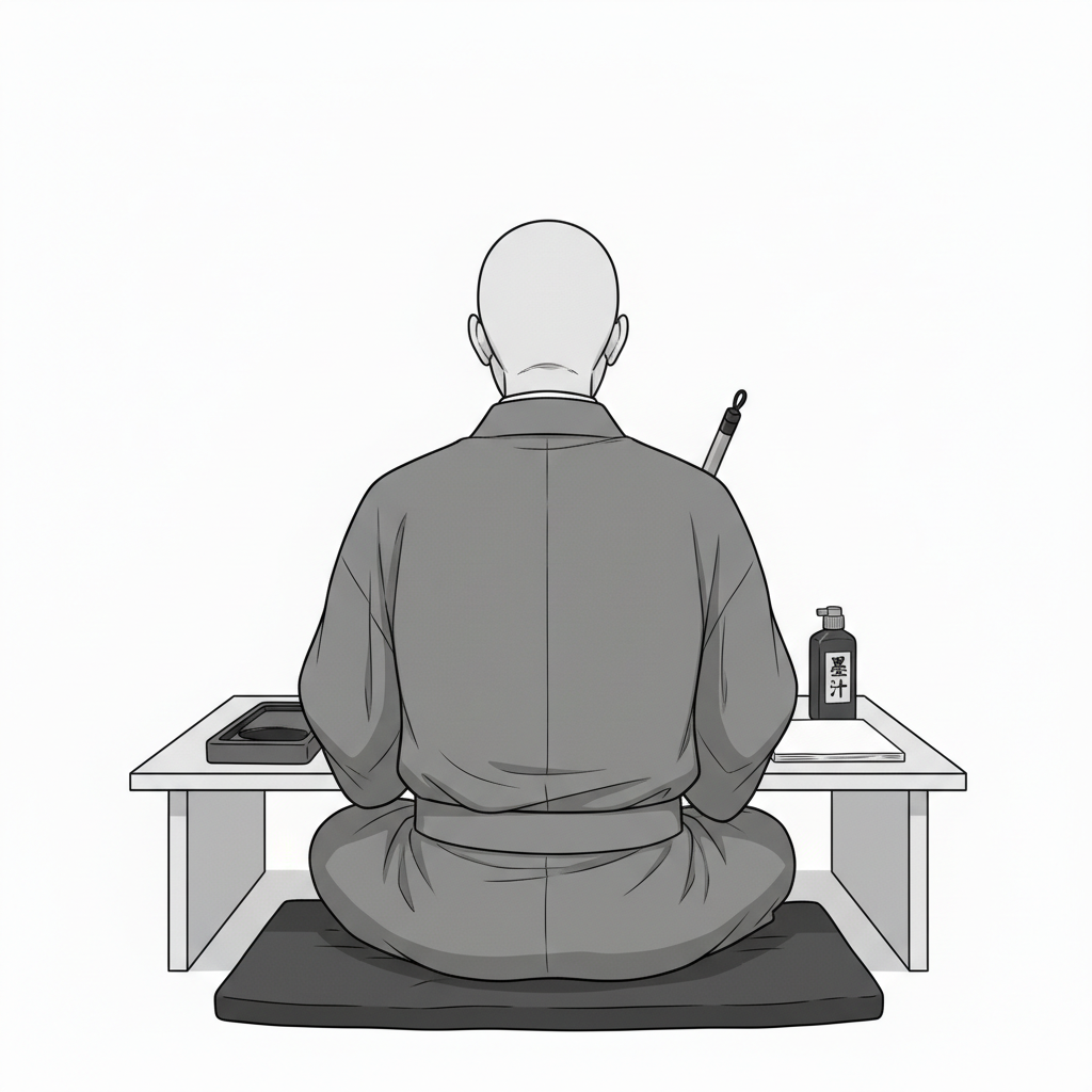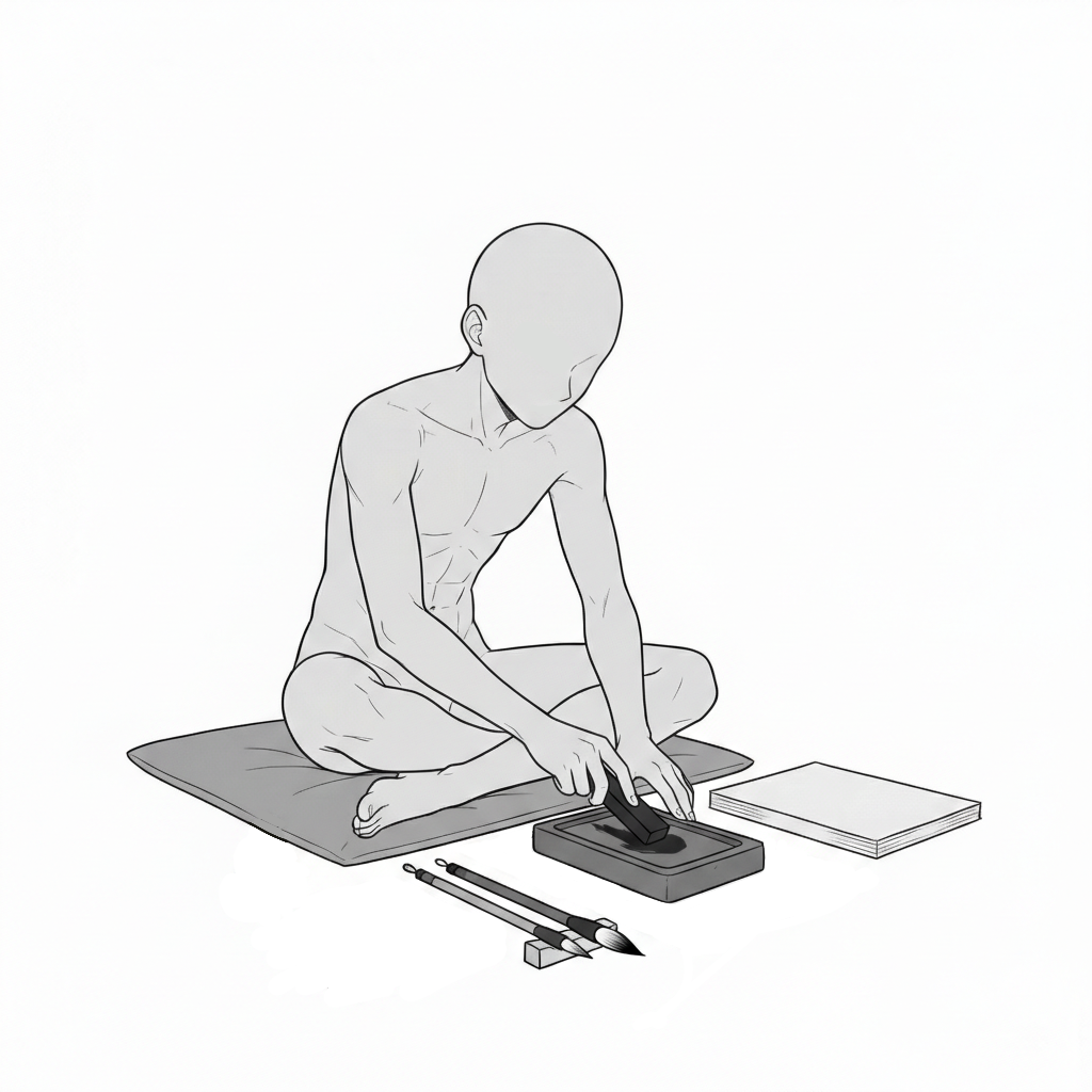 床に座り、硯に墨を含ませる書道前の所作を丁寧に表現しています。