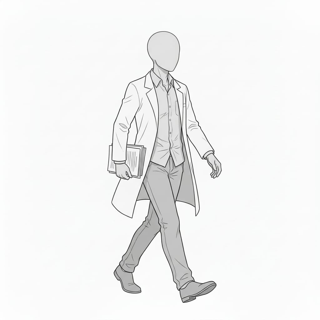 書類を手に自然に歩く白衣の男性を描いた、医療や研究シーンに使いやすい全身ポーズ素材です。