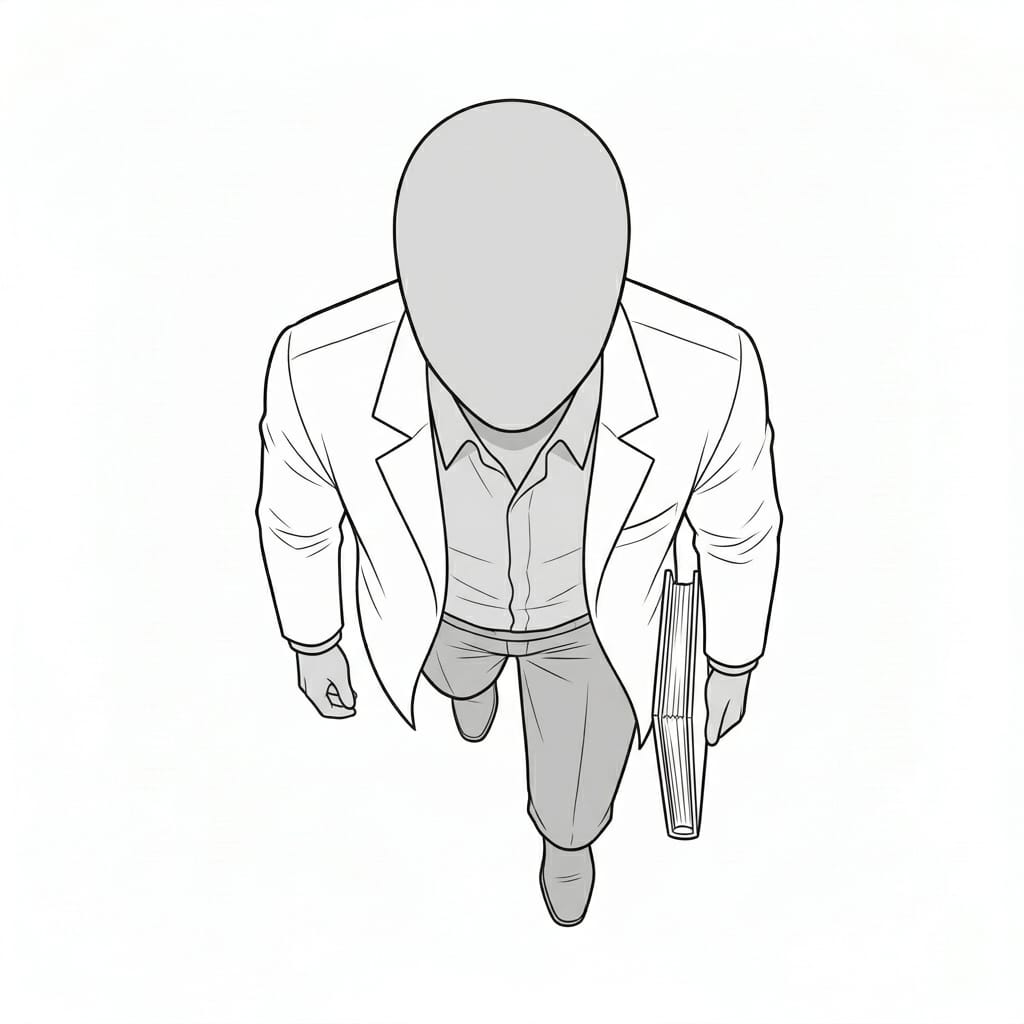 白衣の男性が書類を持って歩く俯瞰ポーズ|医療従事者・研究職の人物素材