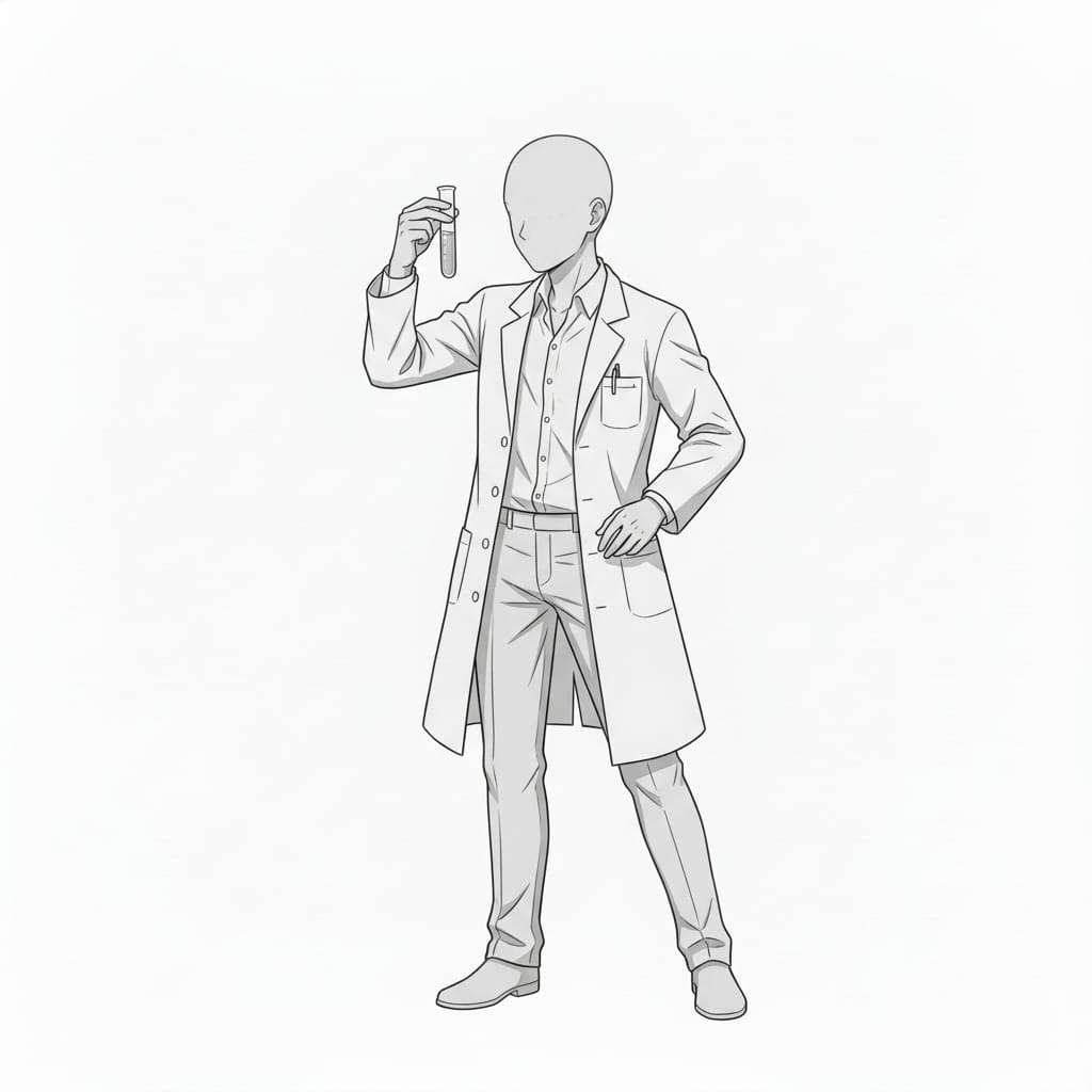 試験管を観察する仕草が伝わる、研究者や科学者キャラクターに適した立ちポーズ素材です。