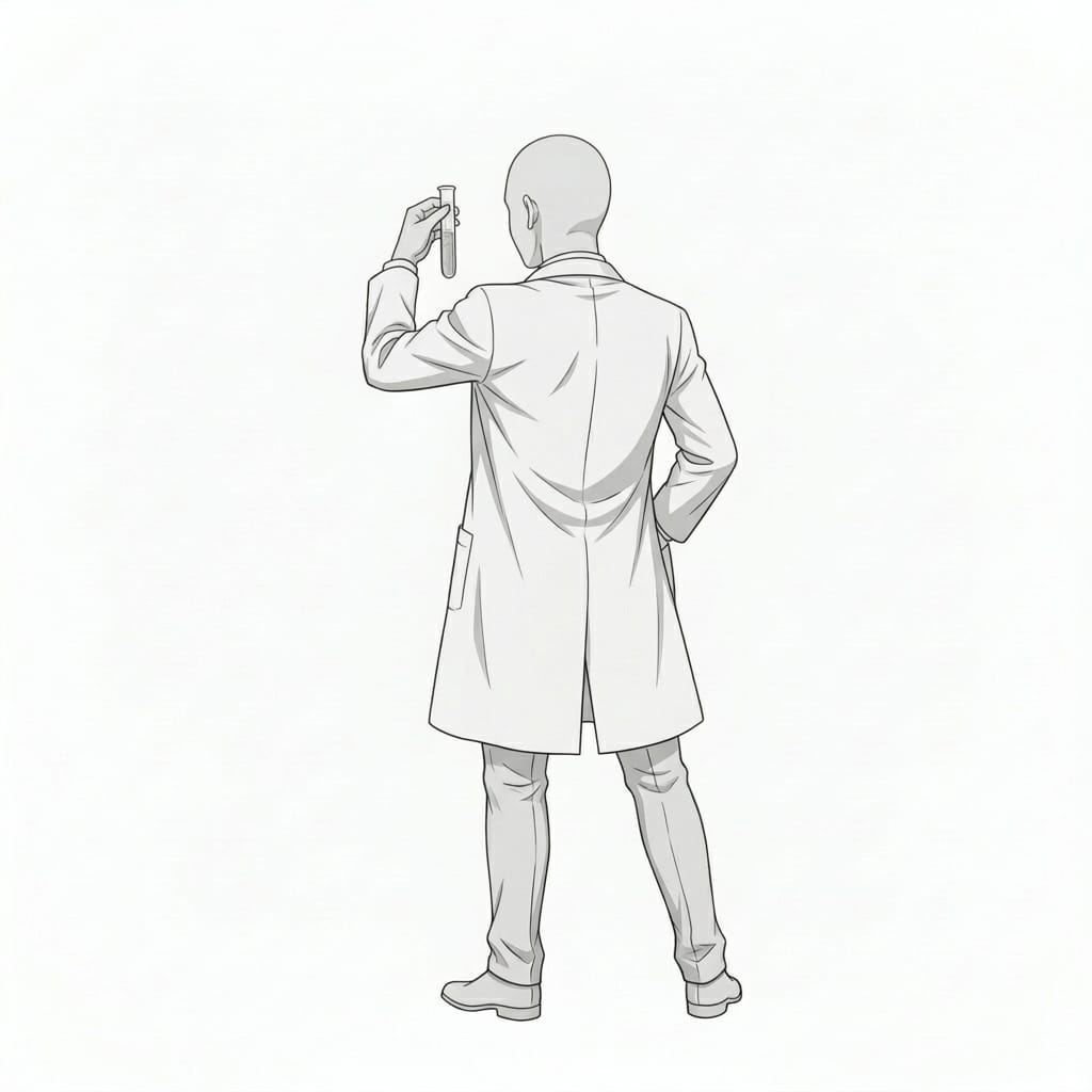 白衣の男性が試験管を持つ後ろ姿ポーズ|実験・研究シーン向け人物素材