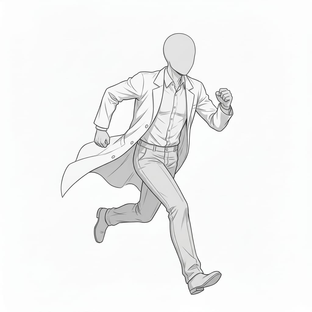 躍動感のある走り姿を描ける、緊急対応や移動シーンに便利な白衣男性のポーズ素材です。