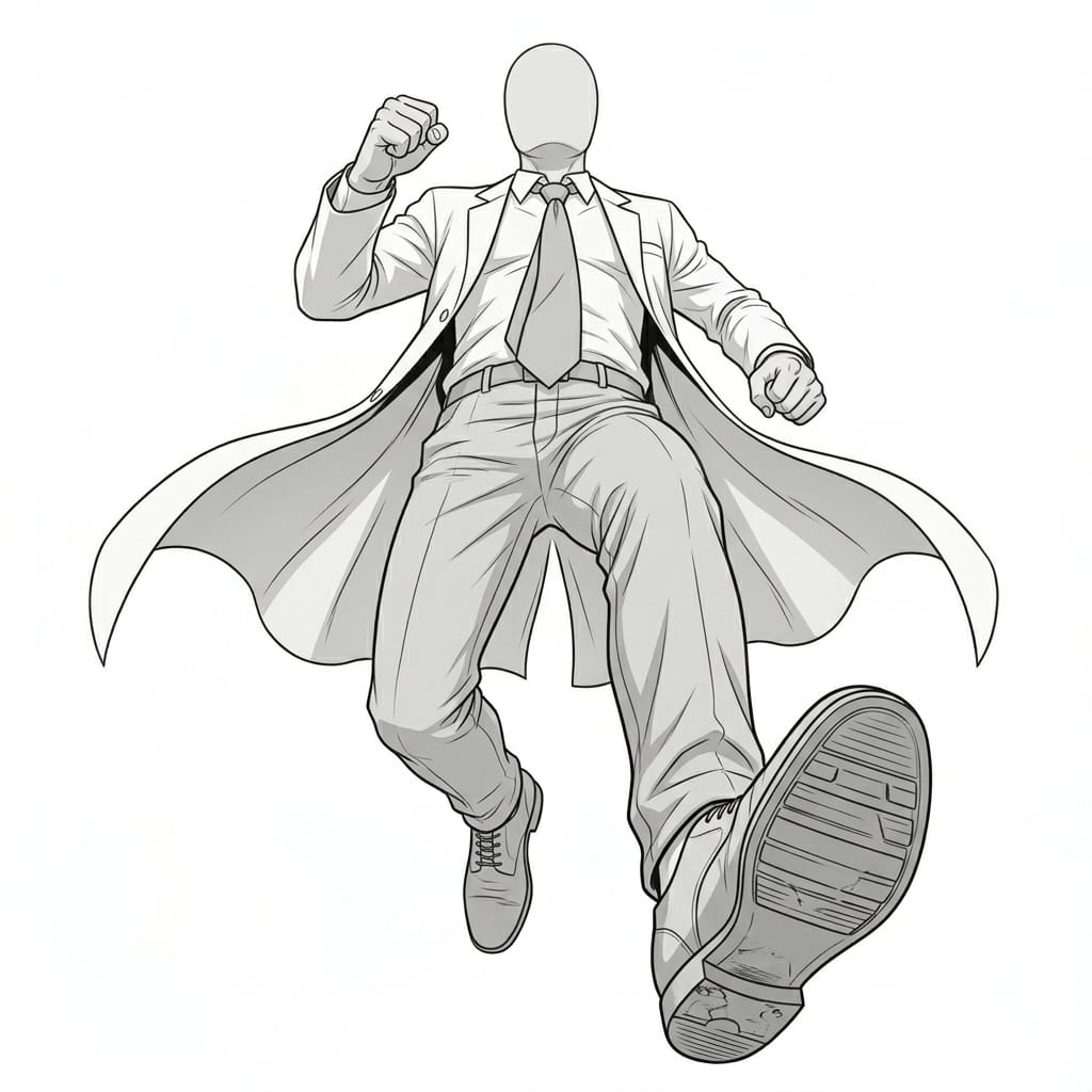 見上げる視点で迫力を演出できる、白衣の男性キャラクター向けローアングルポーズ素材です。