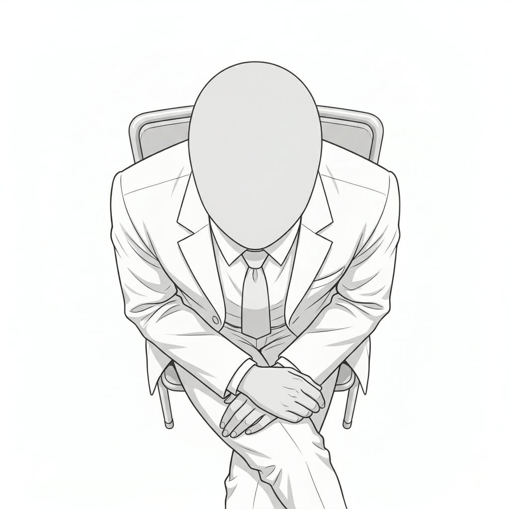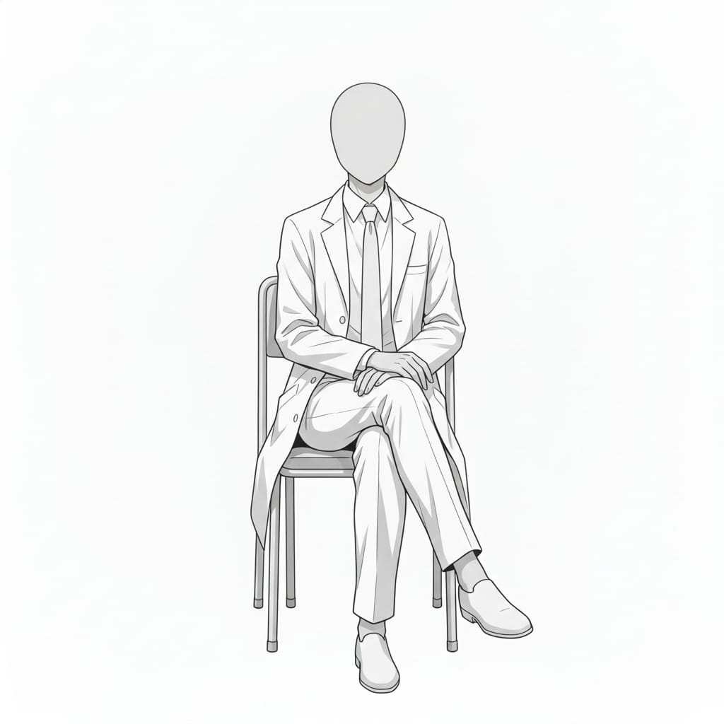 脚を組んで落ち着いて座る姿を表現できる、面談や診察場面にも使いやすい着座ポーズ素材です。