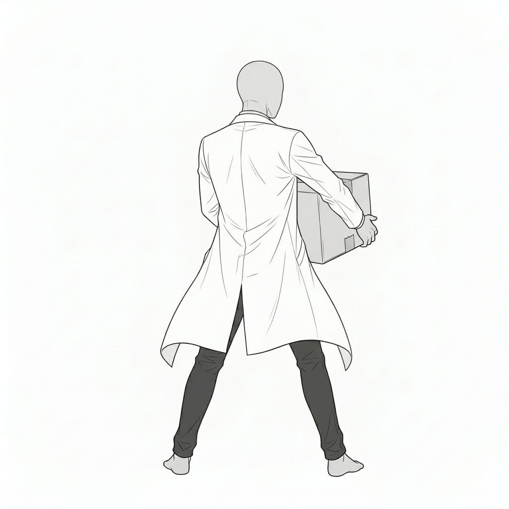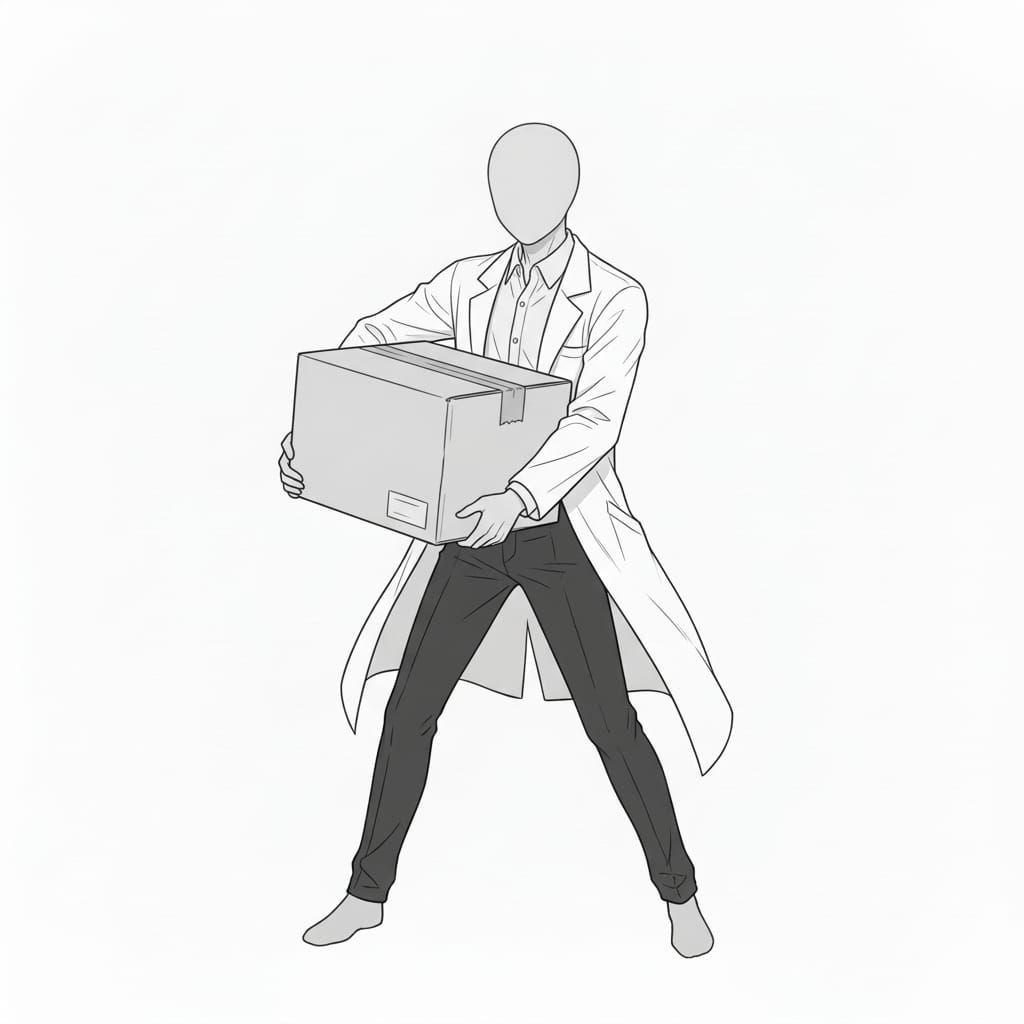 荷物を抱えて運搬する動作を描ける、作業シーンや搬入場面に便利な白衣男性のポーズ素材です。