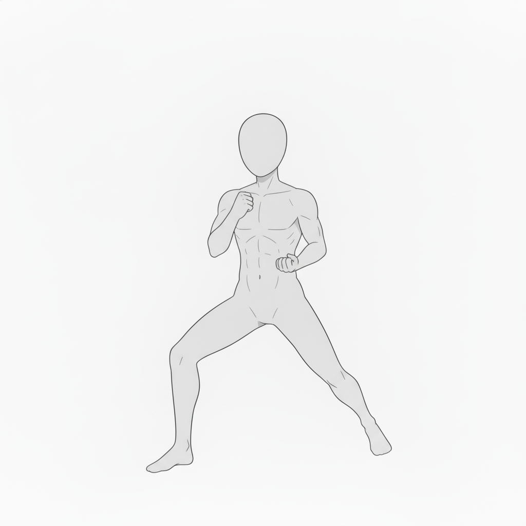 下半身を大きく開いた前屈立ちで構えた姿勢を表現し、空手の基本動作解説に最適です。