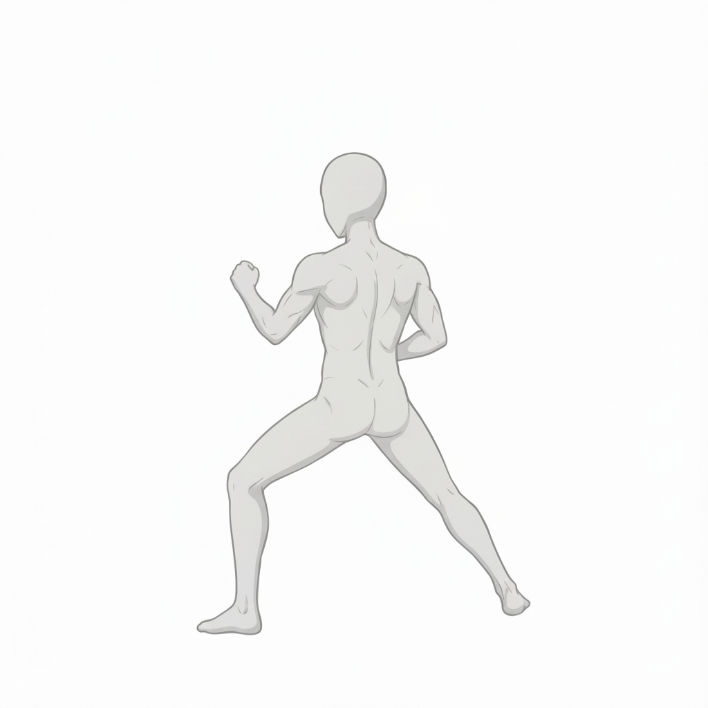 背中側から前屈立ちを捉え、体重配分や姿勢の安定感を確認しやすいポーズです。